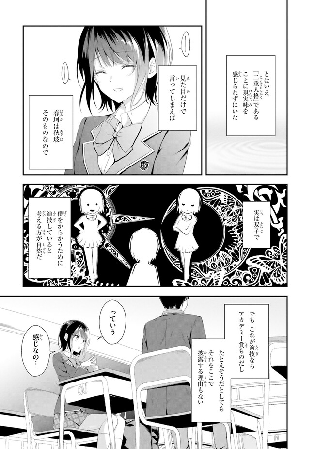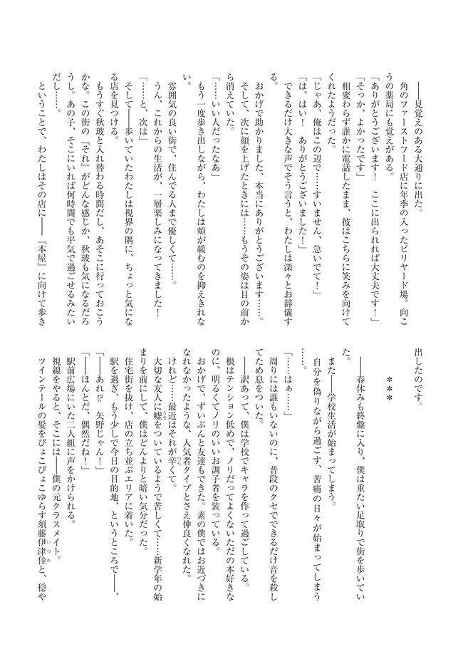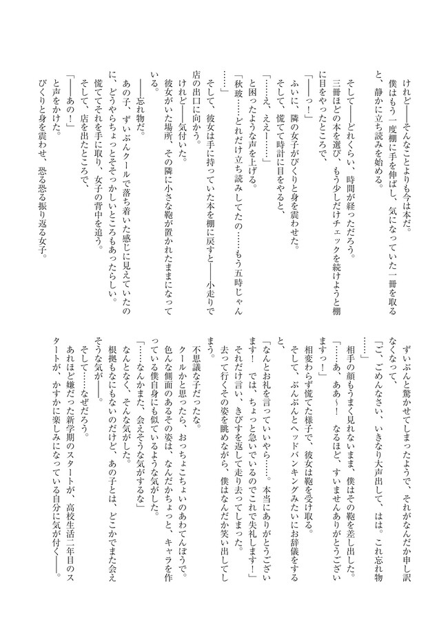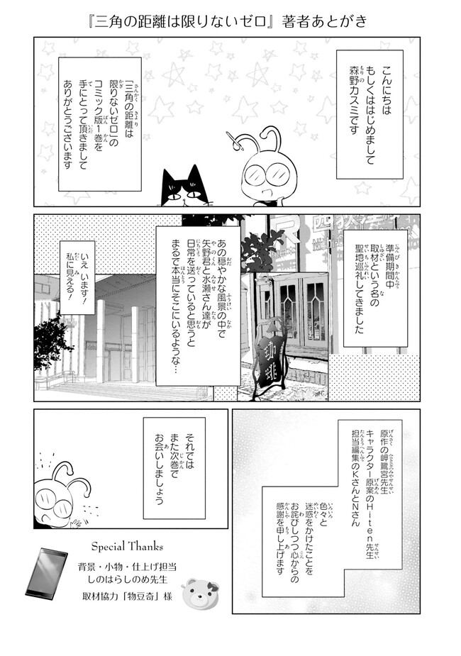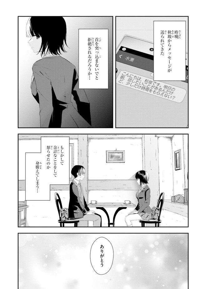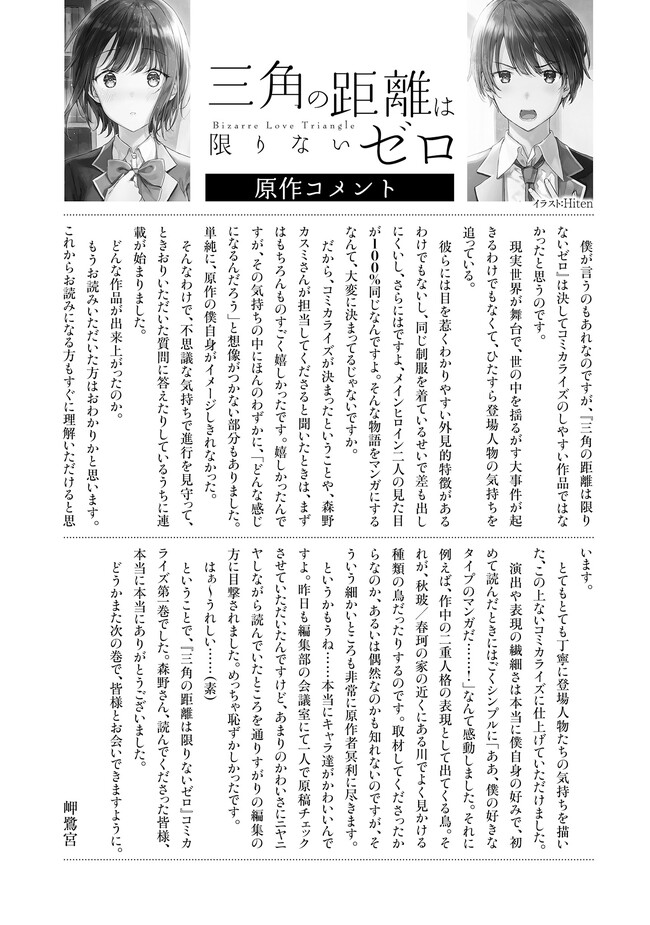 三角の距離は限りないゼロ 【コミックス1巻公開】 三角の距離は限りないゼロ 投稿者 admin - 3年 前に 幸せな読書漫画 三角の距離は限りないゼロ 【コミックス1巻公開】 , いいねと共有ボタンをクリックすることを忘れないでください. Manga 三角の距離は限りないゼロ 常に更新されます 無料コミック Comic Top. 他のマンガの更新を読むことを忘れないでください。 マンガコレクションのリスト 無料コミック Comic Top マンガリストメニューにあります. お友達と共有しましょう! Facebook Twitter Pinterest Whatsapp 前のエピソード すべての章 次のエピソード リスト ページング Loading.. 前のエピソード すべての章 次のエピソード リスト ページング お友達と共有しましょう! Facebook Twitter Pinterest Whatsapp お気に入りに追加に続く 0 人 三角の距離は限りないゼロ 人前で「偽りの自分」を演じてしまう僕。そんな僕が恋したのは、どんなときも自分を貫く物静かな転校生、水瀬秋玻だった。けれど、彼女の中にはもう一人――優しくてどこか抜けた少女、水瀬春珂がいた。僕と「彼女たち」の不思議で歪な三角関係。その距離はどこまでも限りなく、ゼロに近づいていく――。 いま一番切なく愛しい三角関係恋物語。 Hiten(キャラクター原案)岬 鷺宮(原作)森野カスミ(漫画) コミカライズ三角関係恋愛