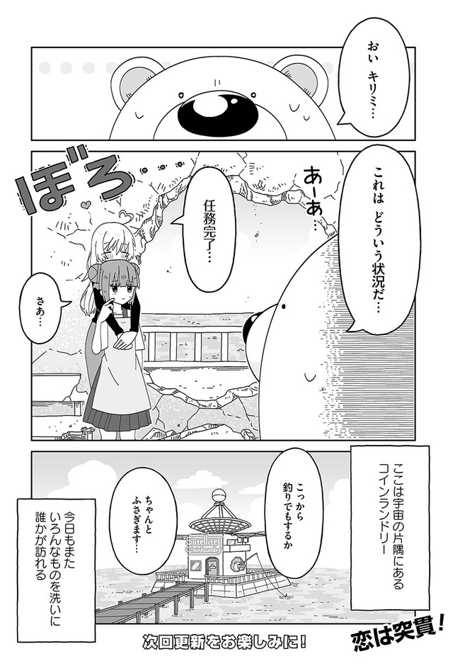 ここは宇宙の片隅にあるコインランドリー 「サテライト・コインランドリー」。 水に恵まれたこの星に、今日もまたいろんなものを洗いに誰かが訪れる――。