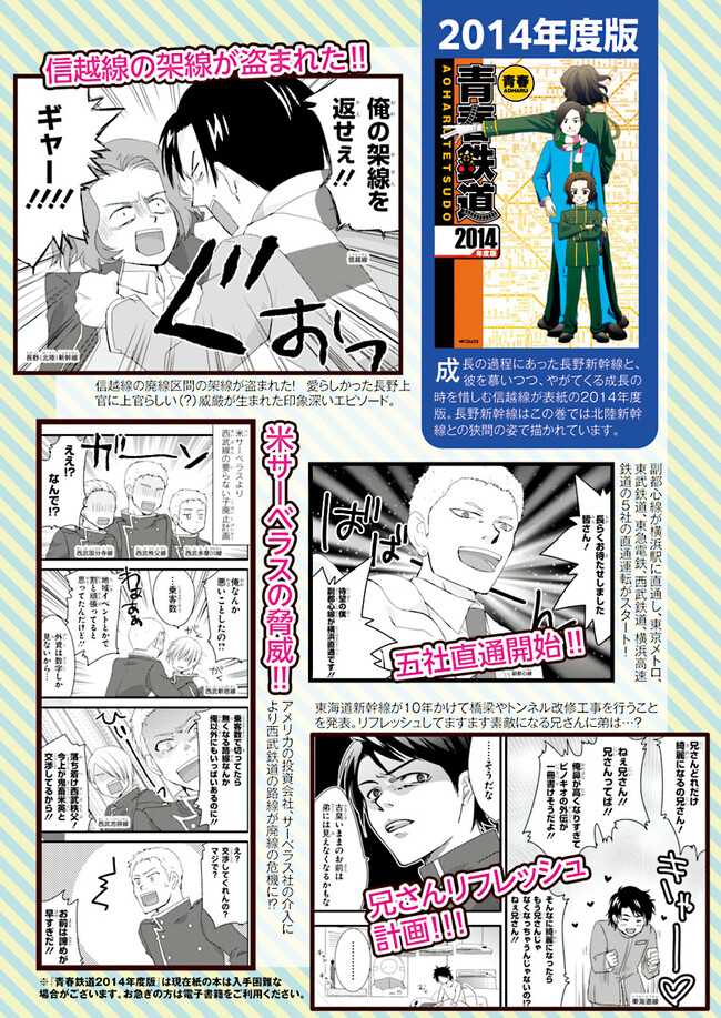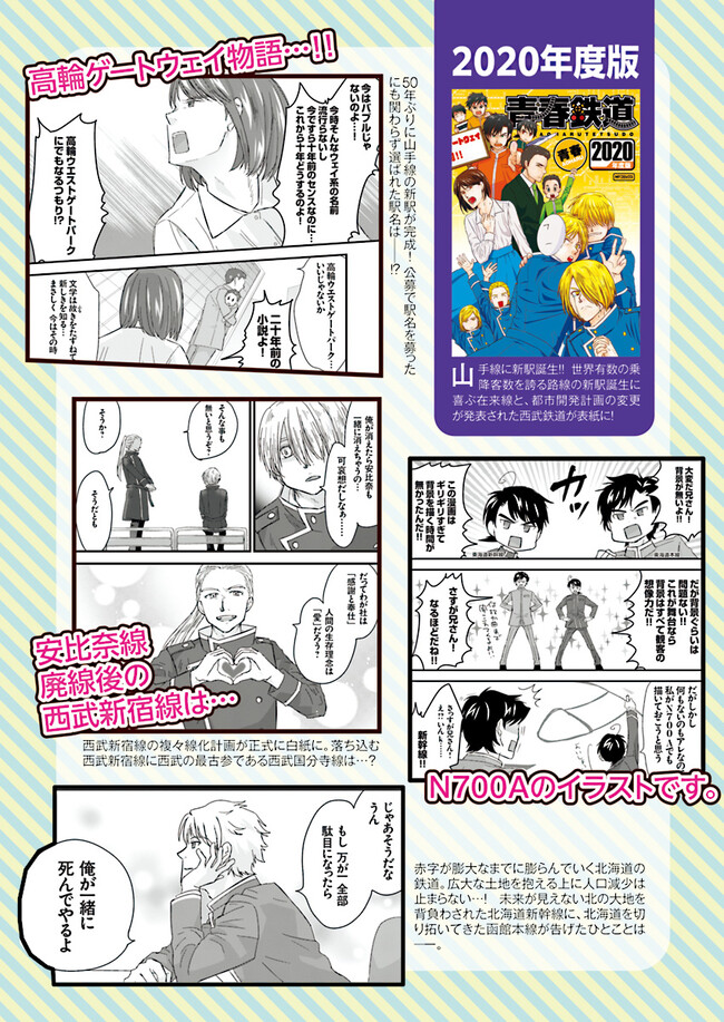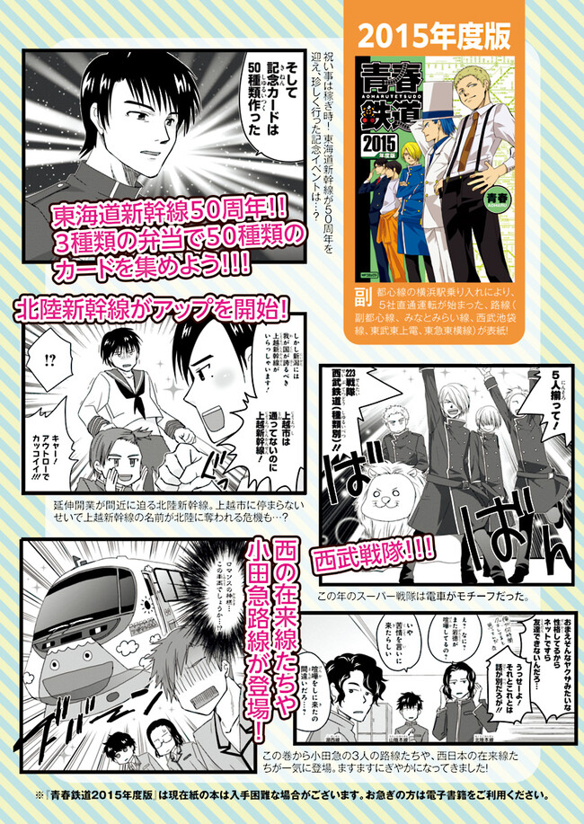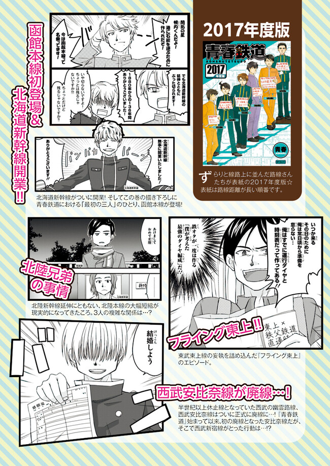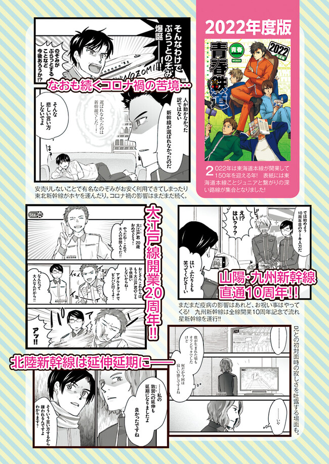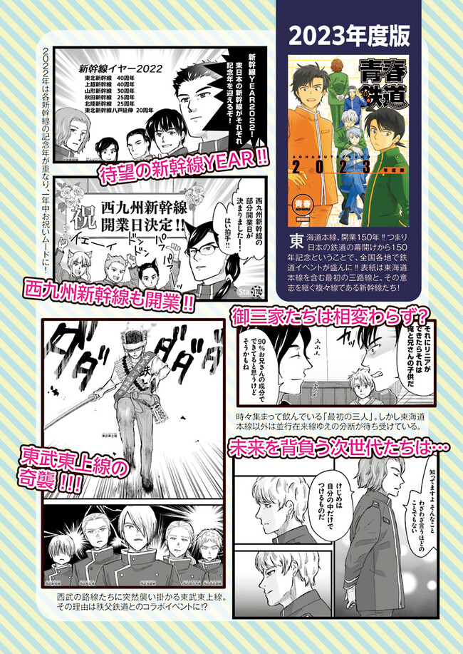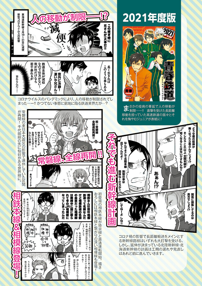 日本全国に繋がる鉄道網…そんな鉄道路線たちを擬人化した鉄道トリビアコメディ!日本一の収益を誇る東海道新幹線はものすごく金に細かかったり、超かっこいい新幹線500系を誇る山陽新幹線はイケメンなのに個性の強い路線(東海道新幹線&九州新幹線)に挟まれて不憫だったり……と、読めば妙に納得するユニークで愛すべき擬人化路線たち!首都圏中心に新潟、東北方面などの路線も含め、登場路線数は90路線以上!あなたの街の鉄道も擬人化されているかもしれませんよ? コミックス好評発売中!! 【収録話数】 『青春鉄道2021年度版』Sta.117~136 『青春鉄道2020年度版』Sta.96〜116/鉄ミュスピンオフ稽古場レポート 『青春鉄道2019年度版』Sta75~95/鉄ミュ3稽古場レポート/2018年あけましておめでとう号 『青春鉄道2018年度版』Sta-53~Sta-74/鉄ミュ2稽古場レポート 『青春鉄道2017年度版』Sta-34~Sta-52、黎明編番外編 『青春鉄道2016年度版』Sta-15〜Sta-33、鉄ミュ稽古場レポート 『青春鉄道2015年度版』Sta-1〜Sta-14