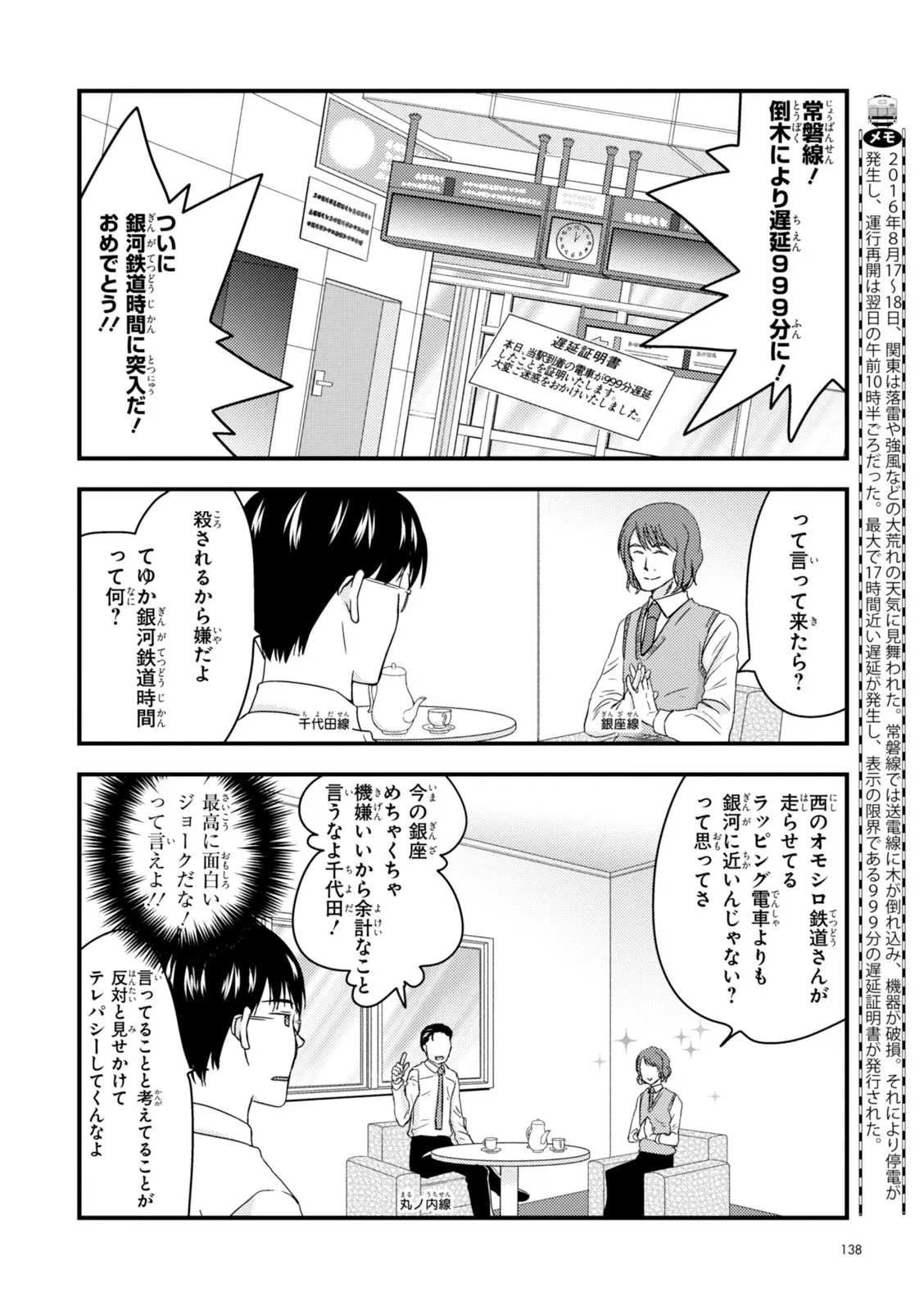 日本全国に繋がる鉄道網…そんな鉄道路線たちを擬人化した鉄道トリビアコメディ!日本一の収益を誇る東海道新幹線はものすごく金に細かかったり、超かっこいい新幹線500系を誇る山陽新幹線はイケメンなのに個性の強い路線(東海道新幹線&九州新幹線)に挟まれて不憫だったり……と、読めば妙に納得するユニークで愛すべき擬人化路線たち!首都圏中心に新潟、東北方面などの路線も含め、登場路線数は90路線以上!あなたの街の鉄道も擬人化されているかもしれませんよ?