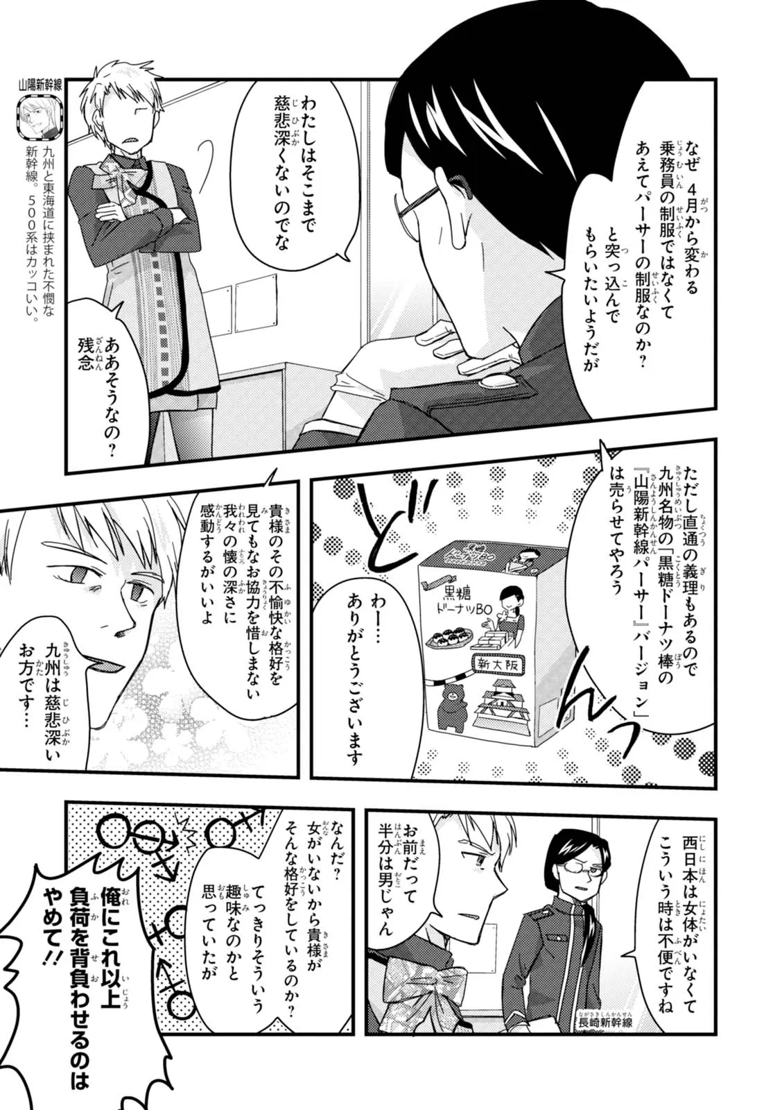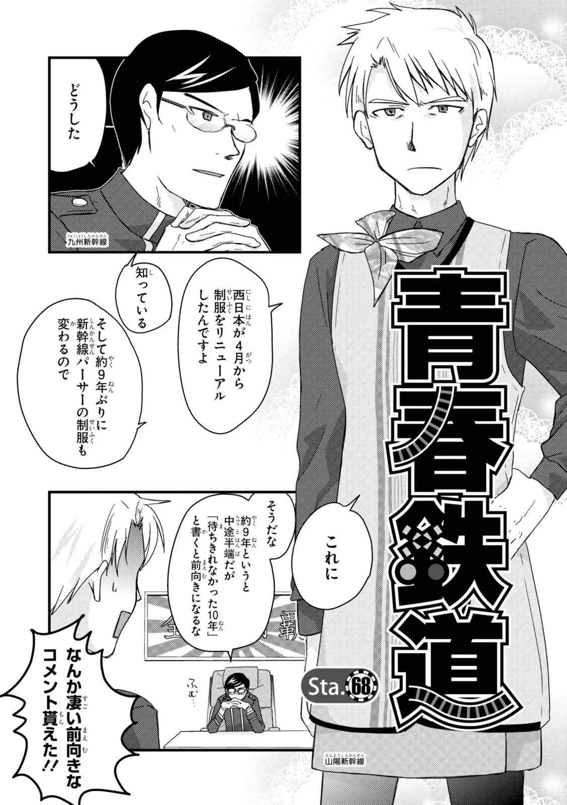 日本全国に繋がる鉄道網…そんな鉄道路線たちを擬人化した鉄道トリビアコメディ!日本一の収益を誇る東海道新幹線はものすごく金に細かかったり、超かっこいい新幹線500系を誇る山陽新幹線はイケメンなのに個性の強い路線(東海道新幹線&九州新幹線)に挟まれて不憫だったり……と、読めば妙に納得するユニークで愛すべき擬人化路線たち!首都圏中心に新潟、東北方面などの路線も含め、登場路線数は90路線以上!あなたの街の鉄道も擬人化されているかもしれませんよ? コミックス好評発売中!! 【収録話数】 『青春鉄道2021年度版』Sta.117~136 『青春鉄道2020年度版』Sta.96〜116/鉄ミュスピンオフ稽古場レポート 『青春鉄道2019年度版』Sta75~95/鉄ミュ3稽古場レポート/2018年あけましておめでとう号 『青春鉄道2018年度版』Sta-53~Sta-74/鉄ミュ2稽古場レポート 『青春鉄道2017年度版』Sta-34~Sta-52、黎明編番外編 『青春鉄道2016年度版』Sta-15〜Sta-33、鉄ミュ稽古場レポート 『青春鉄道2015年度版』Sta-1〜Sta-14