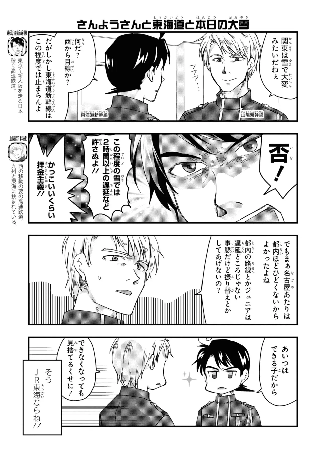 日本全国に繋がる鉄道網…そんな鉄道路線たちを擬人化した鉄道トリビアコメディ!日本一の収益を誇る東海道新幹線はものすごく金に細かかったり、超かっこいい新幹線500系を誇る山陽新幹線はイケメンなのに個性の強い路線(東海道新幹線&九州新幹線)に挟まれて不憫だったり……と、読めば妙に納得するユニークで愛すべき擬人化路線たち!首都圏中心に新潟、東北方面などの路線も含め、登場路線数は90路線以上!あなたの街の鉄道も擬人化されているかもしれませんよ?