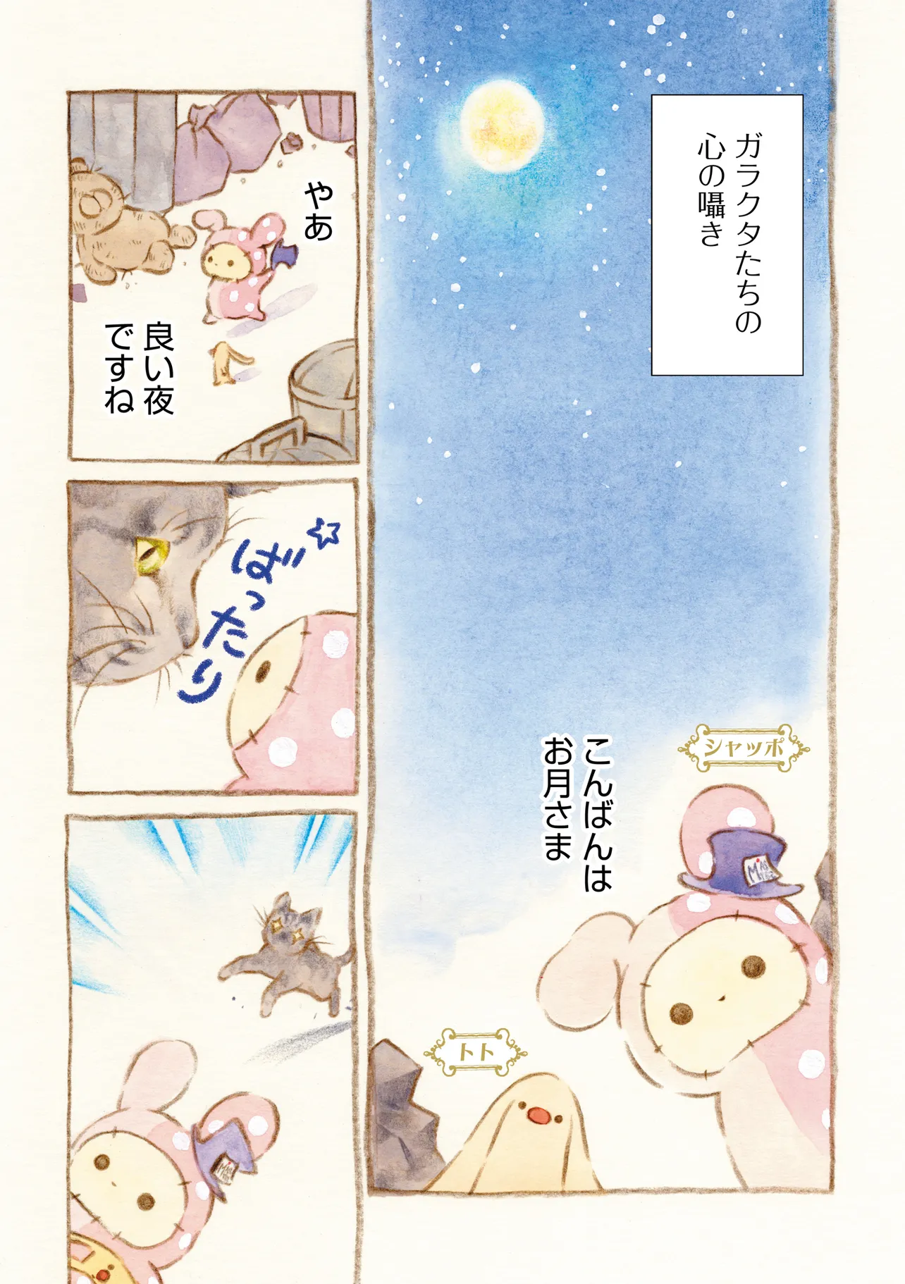 サンエックスの人気キャラクターが初コミックス化!Twitterでも「泣ける」と話題沸騰のマンガが4/19に単行本化!! 「たまには泣いて、お話ししよう」ーー忘れられたぬいぐるみたちの秘密のサーカス団ーー これは遠い昔に忘れてしまったトモダチの物語 ゴミ捨て場で目覚めたぬいぐるみのシャッポは その夜見かけた旅回りのサーカス団に憧れて 『センチメンタルサーカス』を結成する。 仲間は、路地裏、街角、廃墟の遊園地などから やってきた“忘れられた寂しがりや”達 ―いつかまた大切な「持ち主」に出会えるように― さあ、今夜もガラクタたちの一夜の演目 はじまり はじまり。