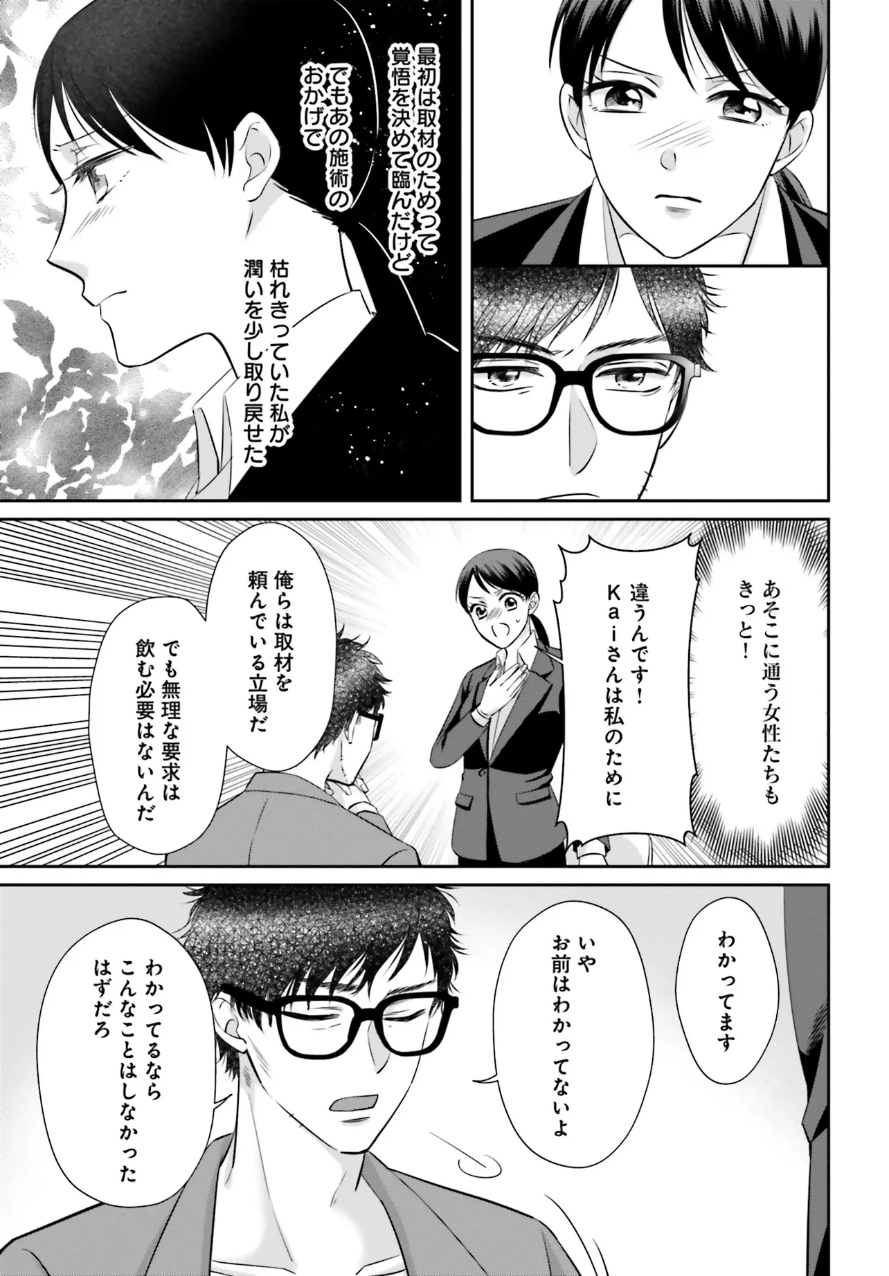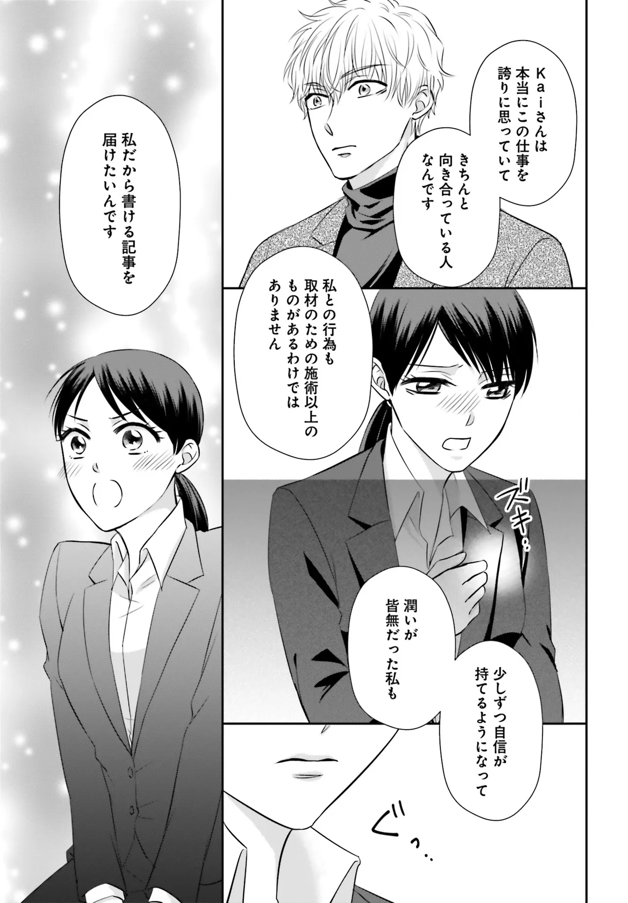 フリーライターの芹沢 紬は、最近隠れたブームになっていると噂の女性向けセラピストへ取材をすることになった。これまでセックスで感じたことのない紬は、自分に務まるか不安になりながらも指定されたホテルに向かう。そこに現れたのは、ものすごく美形の男性! この人がお店のナンバー2・Kaiだという。ホテルの部屋で、まずはインタビュー……のはずがガウンに着替えさせられる紬。