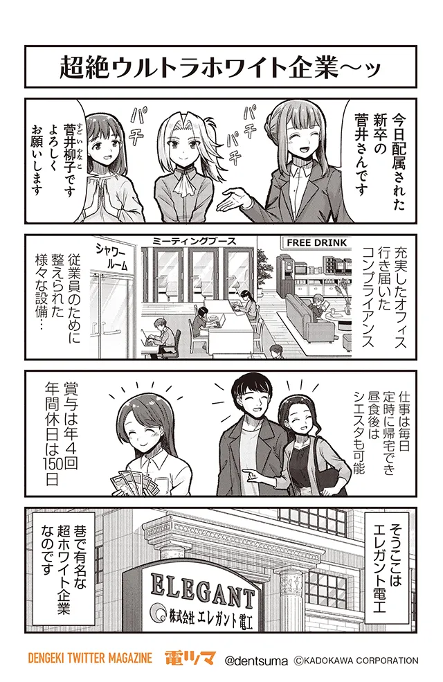新卒でブラック企業に就職した社会人3年目のかすみは、30連勤目の深夜残業の休憩中、屋上で見た流れ星に「有給1日だけください」と願ったところ、不思議な光に包まれて……。気づいたらそこは「ホワイト製作所」の入社挨拶の場だった! ブラック企業の常識に染まったかすみは、ホワイト企業の文化になじめるのか!?