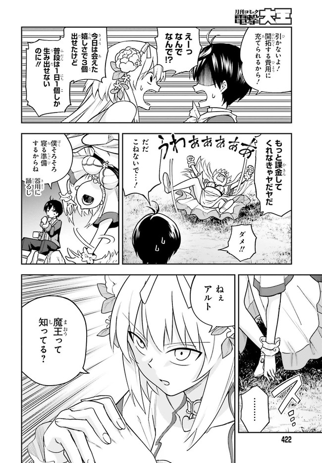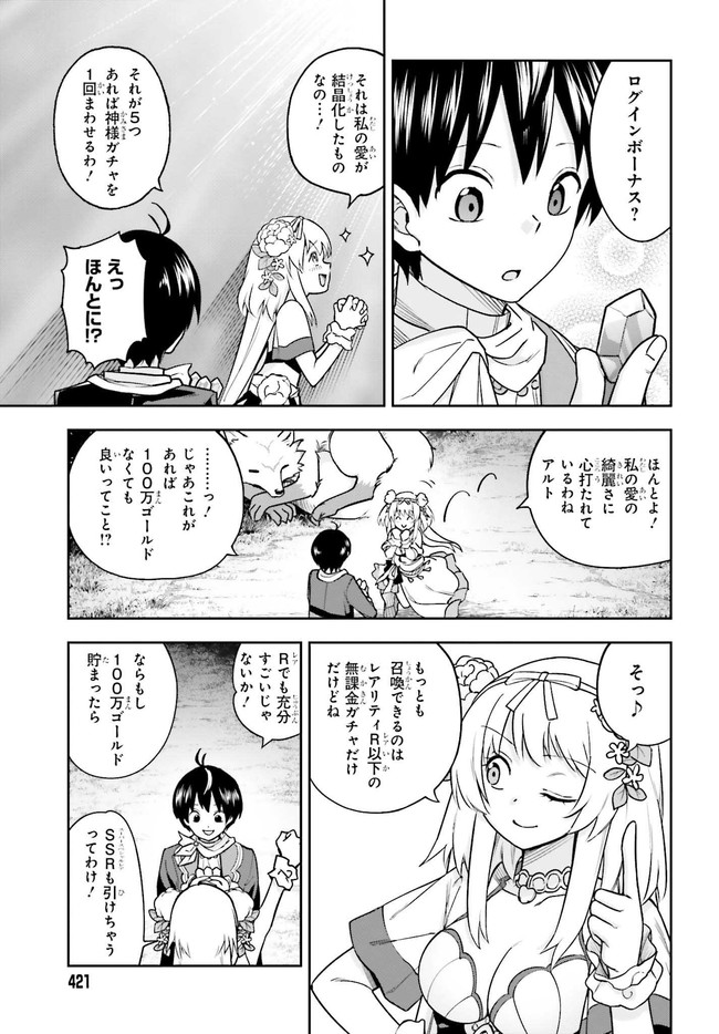 誰もが創造神から【スキル】を与えられる世界。貴族の長男・アルトに与えられたのは、モンスターを召喚するのに多額の課金が必要となる【神様ガチャ】というスキルだった。外れスキル持ちだと断定され、父の反感をかったアルトは全財産をかけてガチャを回す。……しかし、召喚されたのはモンスターではなく、自分のことを女神だと名乗る美少女ルディアだった。