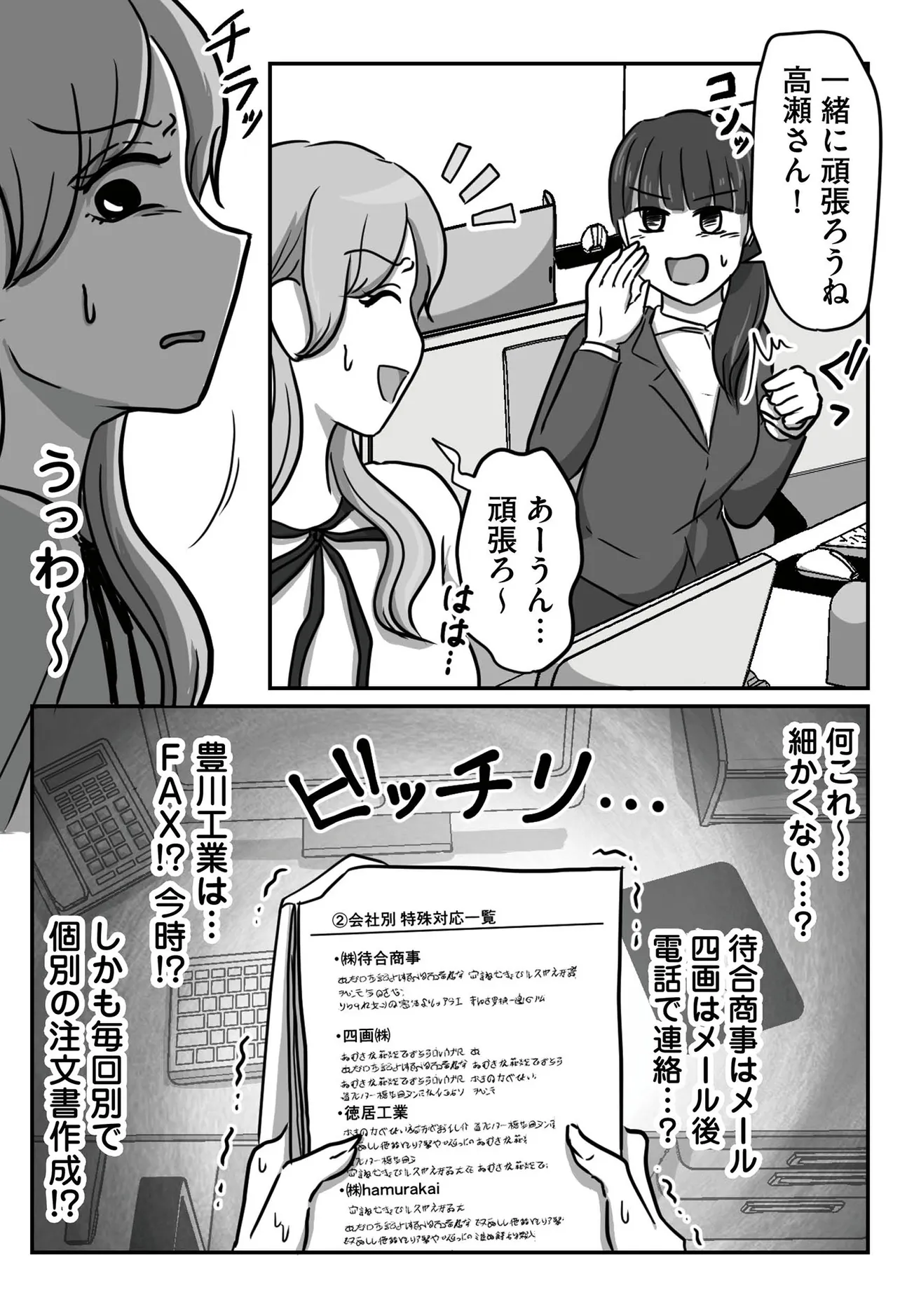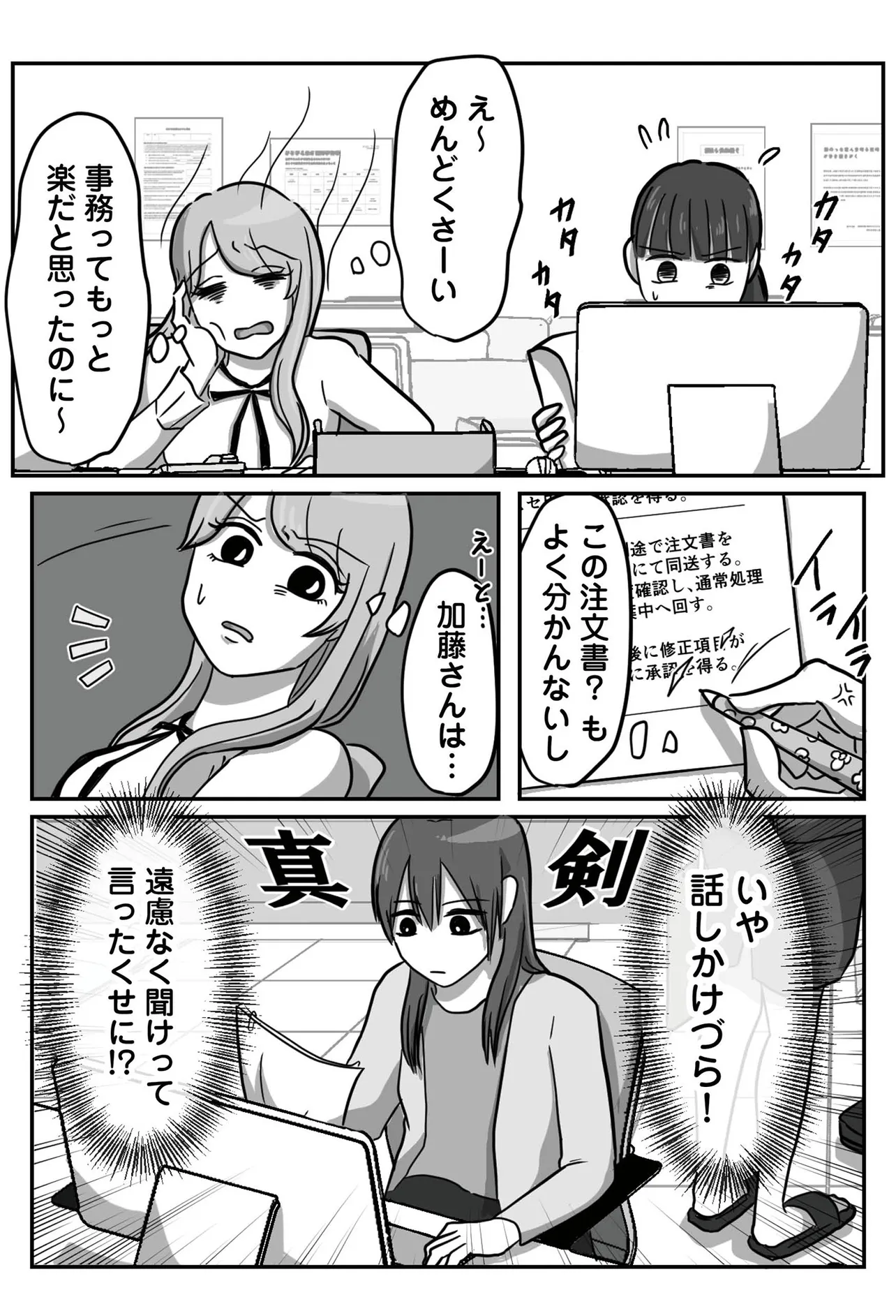 「私HSPだから、配慮してください!」 主人公の加藤さんは一般企業の事務の仕事をするOL。今年、加藤さんの部署に新入社員の高瀬さんが配属された。第一印象は元気で明るい子。 しかし入社一か月ほどして簡単な業務を任せるようになった頃、高瀬さんがよくミスをすることに気づく。加藤さんが高瀬さんにその指摘をすると、ものすごい形相で睨みつけられ……。その後、加藤さんを倉庫に呼びつけた高瀬さん、「私のこと、バカにしてますよね? そういうのすぐわかるんです。だって私…HSPなんで!」