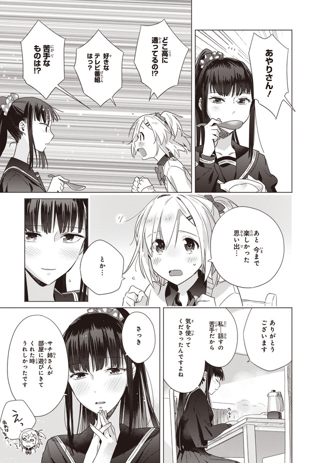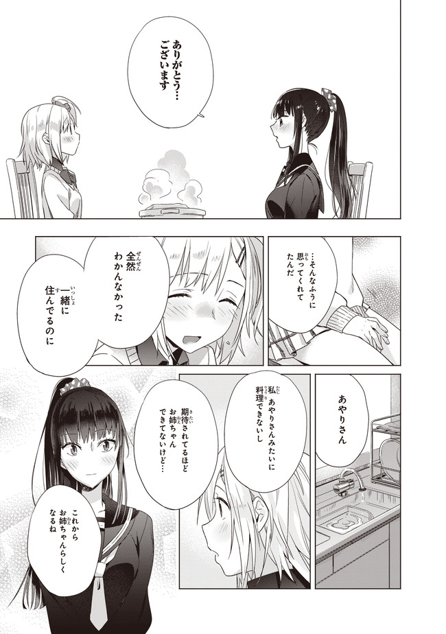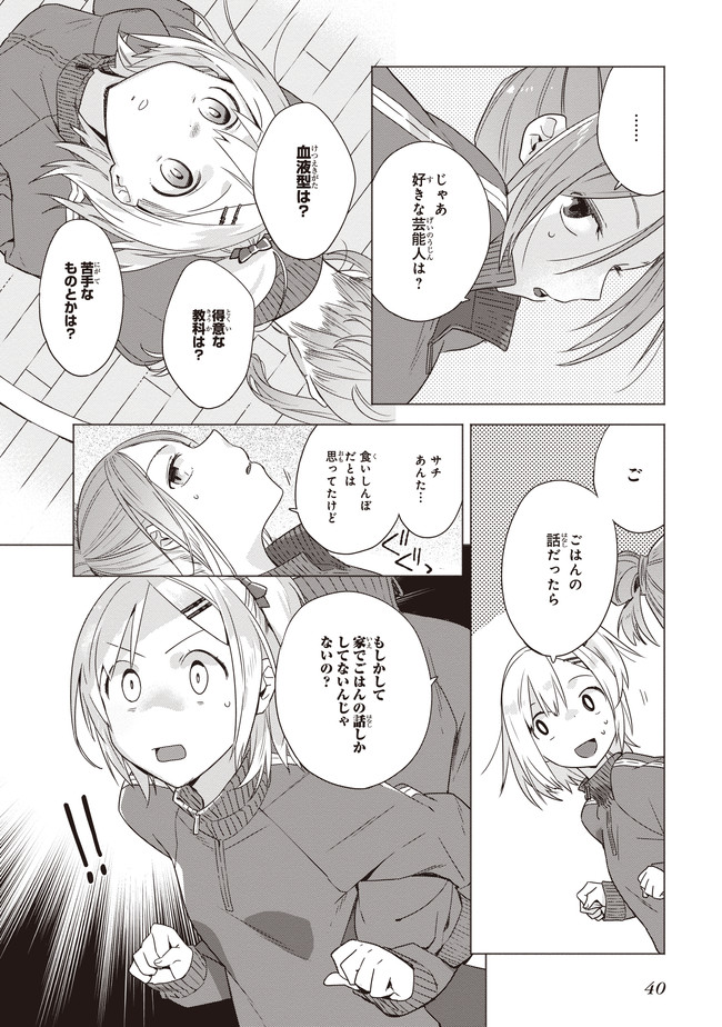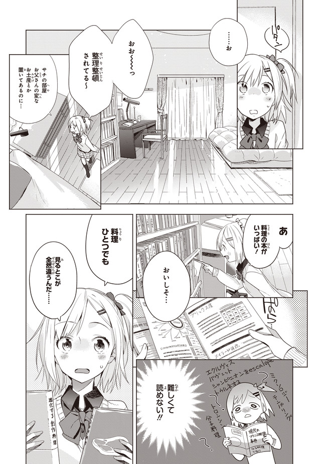 親同士が再婚してすぐに海外出張に発ってしまったため、ふたりで生活することになったサチとあやり。言葉数が少なく目つきの鋭いあやりに対し、サチは物怖じし、これからの同居生活に大きな不安を感じてしまう。そんなとき、父親から届いた荷物は生ハムの原木だった! 料理好きなあやりは、原木を見た途端目を輝かせ……。