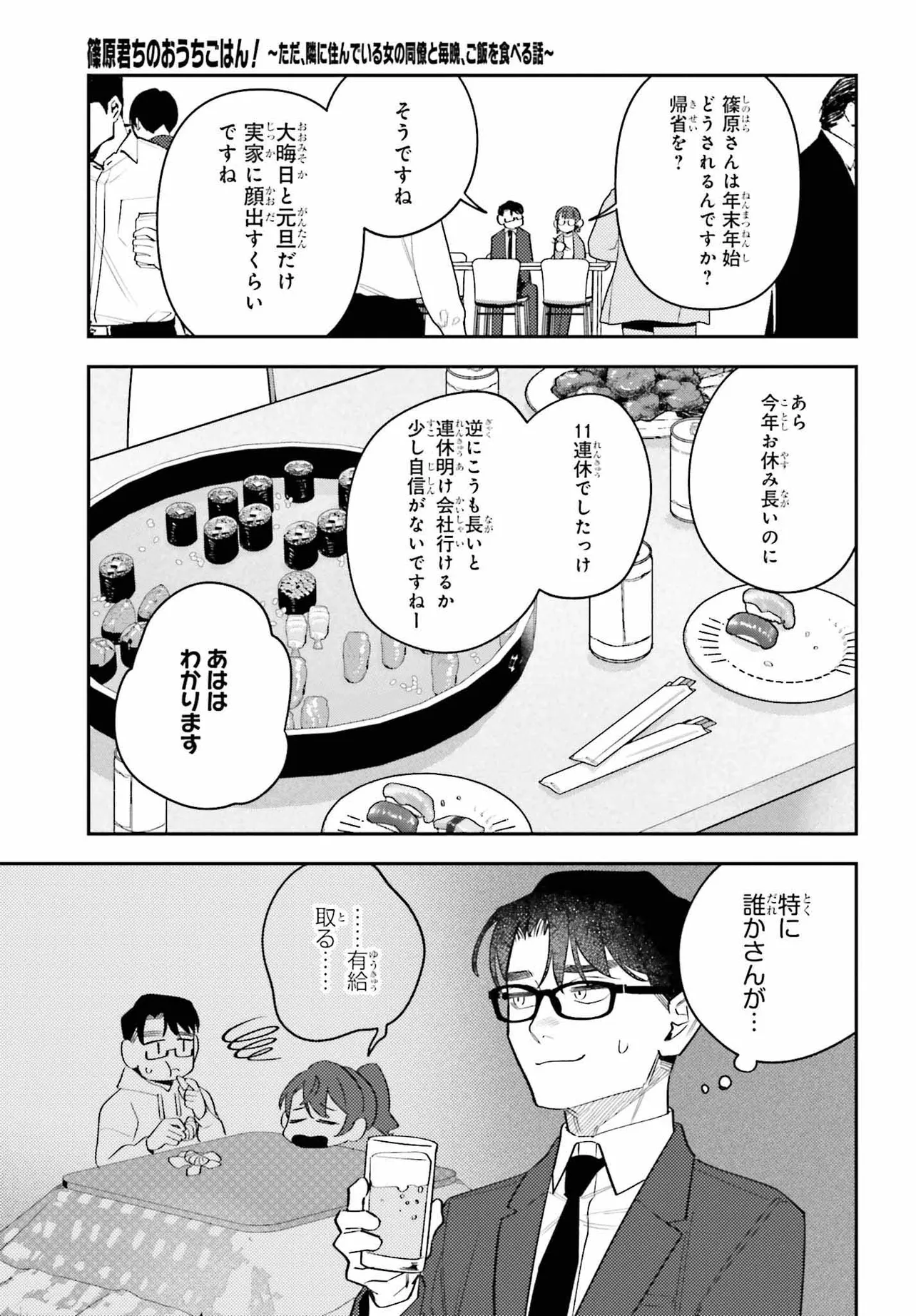 “篠原君ちのおうちごはん! ~ ただ、隣に住んでいる女の同僚と毎晩、ご飯を食べる話~” “第13話 仕事納め! 今年も一年、お疲れ様でした。出前の寿司とデパ地下の唐揚げ③-1”