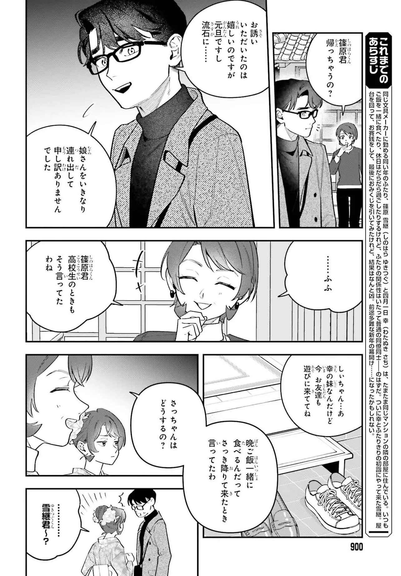 同じ文具メーカーに勤める篠原雪継と四月一日幸は、たまたまマンションの隣の部屋に住んでいる。いつも一緒にご飯を食べたり、だらだら過ごしたりするが、いたって普通の同僚同士の関係――そのはずだ。こじらせちゃった社会人男女のクッキングストーリー♪