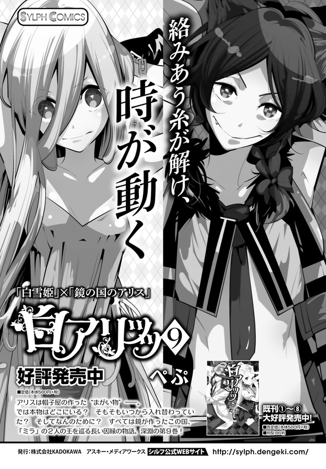 白雪姫×鏡の国のアリス―― 有名童話と物語の衝撃的コラボ!! ある日突然、不思議な世界に連れてこられた主人公・白雪。この世界ではいろいろなモノがアベコベで、文字は逆さだし標識も逆向き…。そんな鏡のような世界から抜け出す方法は1つ。 「アリスを王にすること」 元の世界に戻るため、白雪はアリスと行動を共にし始めるのだが――!?奇妙でワンダーなおとぎファンタジー!