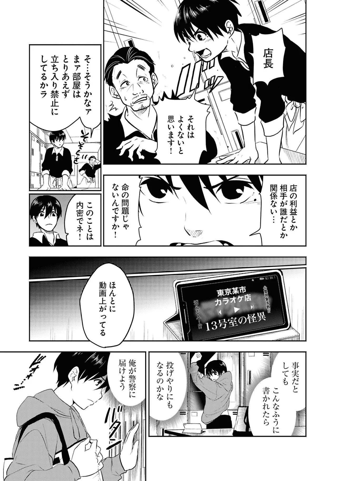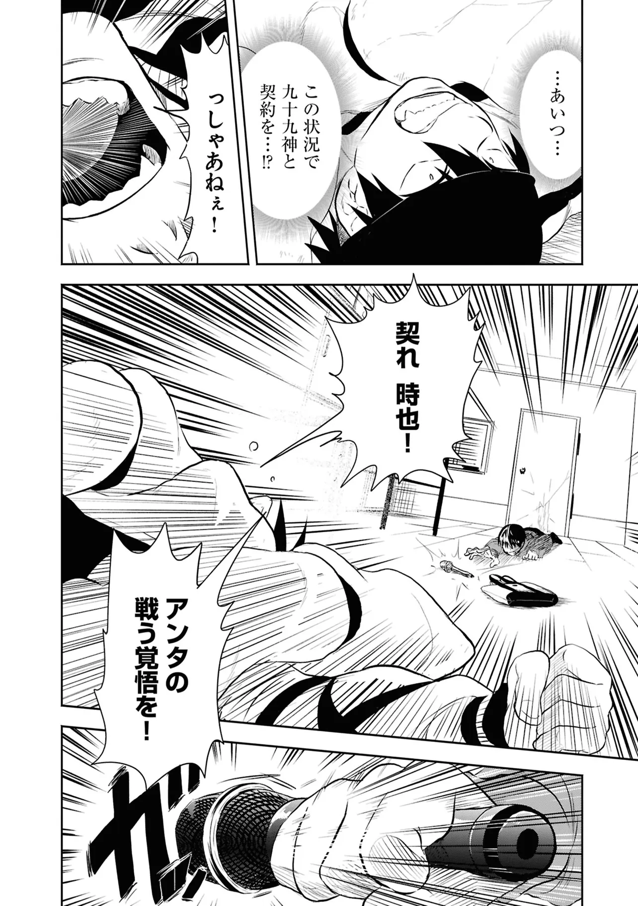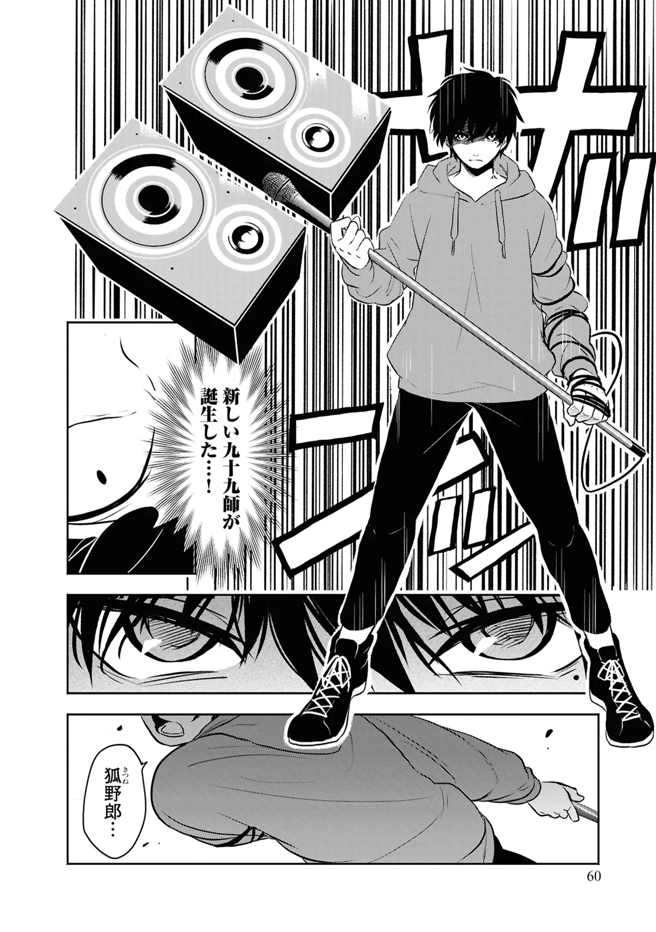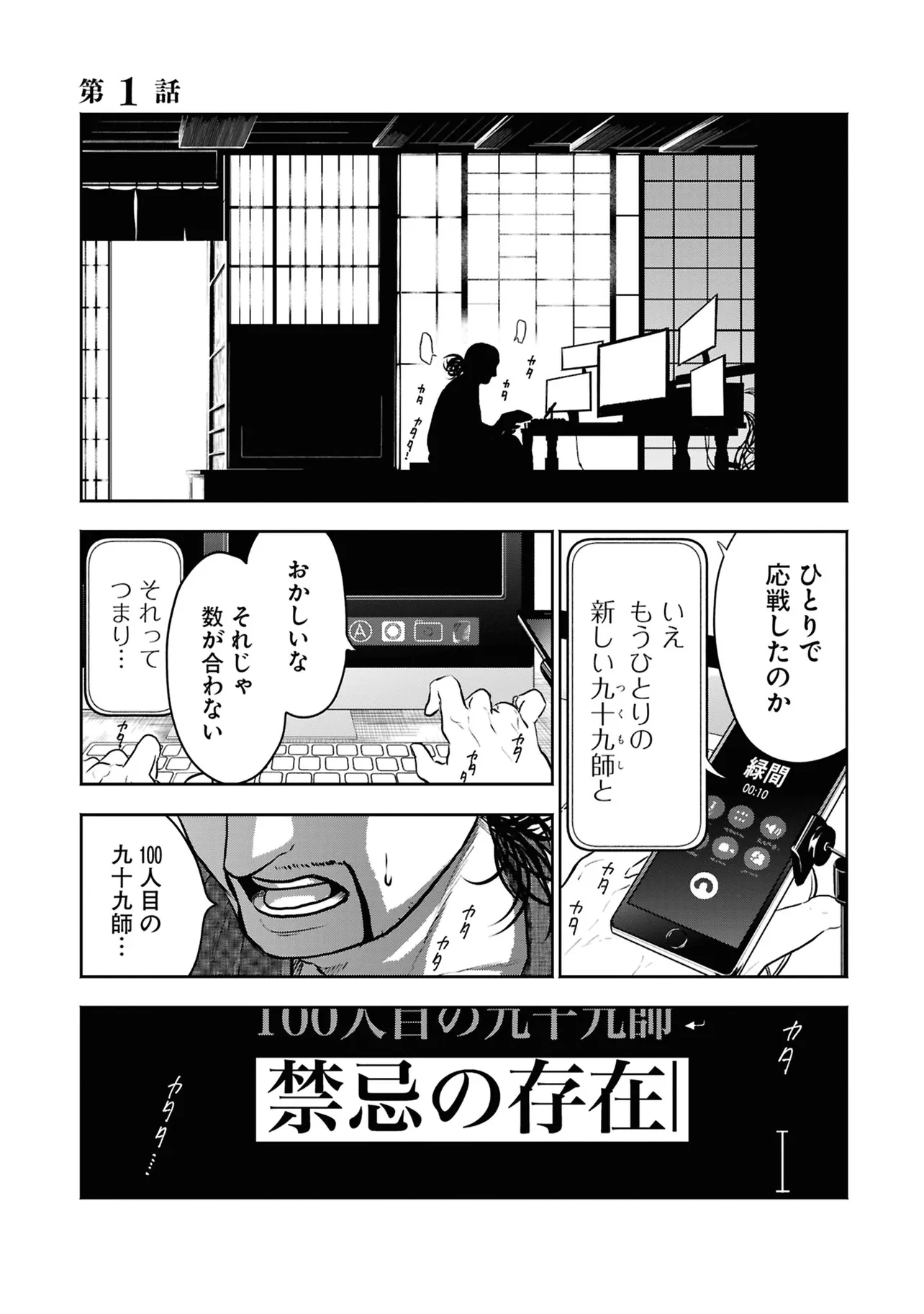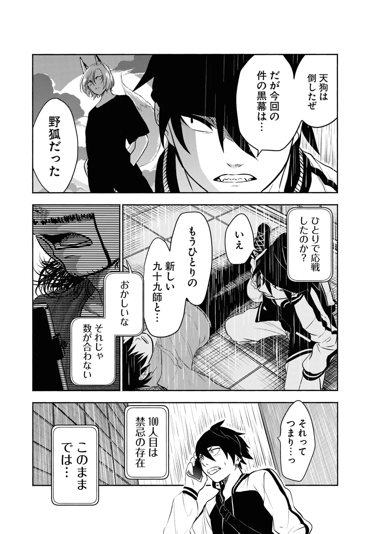 数日前に失踪事件が起こったカラオケ店。 そこでバイトする青木時也はさらなる奇怪な事件に巻きこまれていく。 一方、失踪事件を調査する緑間はその犯人に目星をつけるが正体がわからないままでいた…。 ゲーム実況者「White Tails」のメンバーが登場、 九十九師と妖怪の戦いを描く!!
