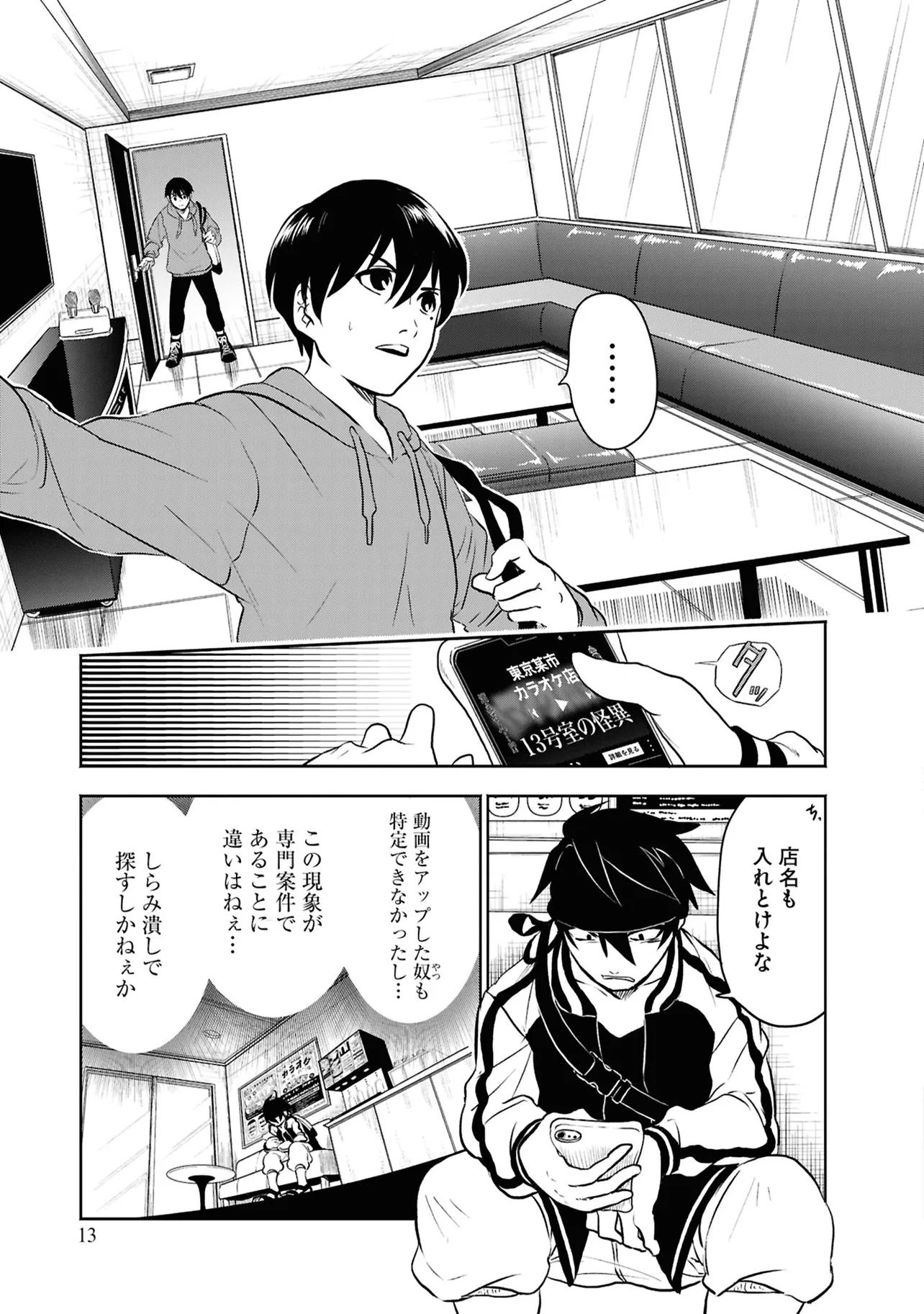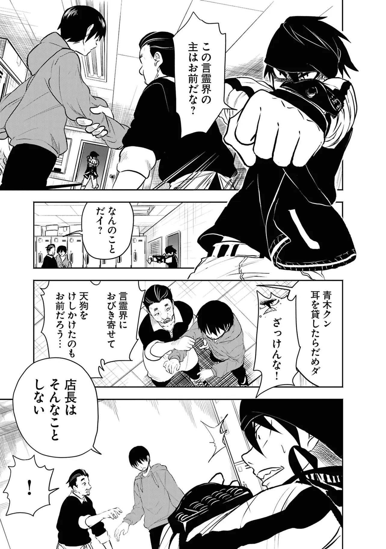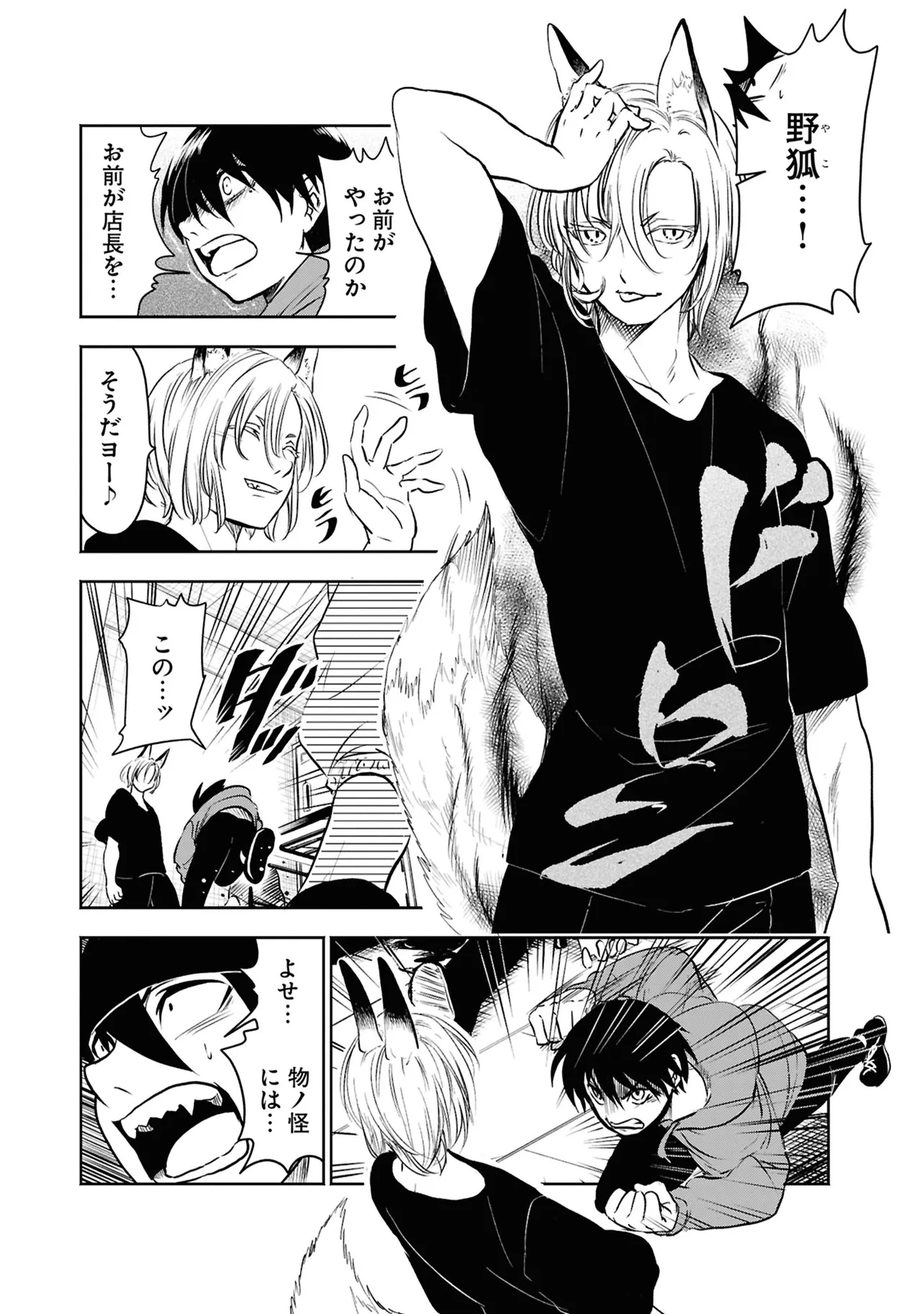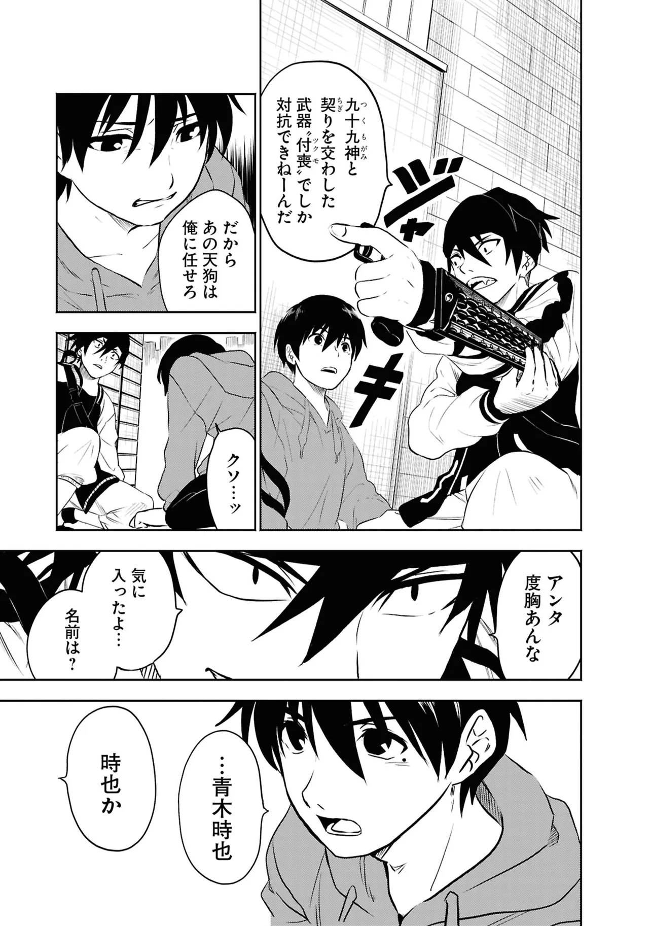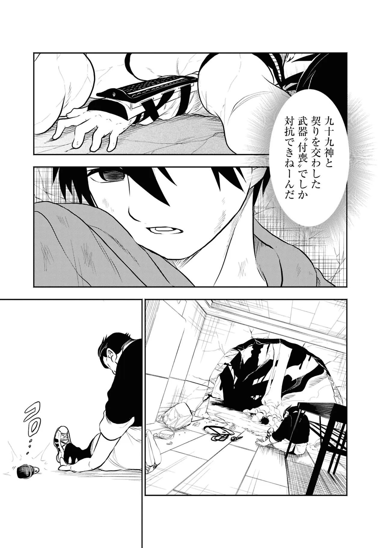 数日前に失踪事件が起こったカラオケ店。 そこでバイトする青木時也はさらなる奇怪な事件に巻きこまれていく。 一方、失踪事件を調査する緑間はその犯人に目星をつけるが正体がわからないままでいた…。 ゲーム実況者「White Tails」のメンバーが登場、 九十九師と妖怪の戦いを描く!!