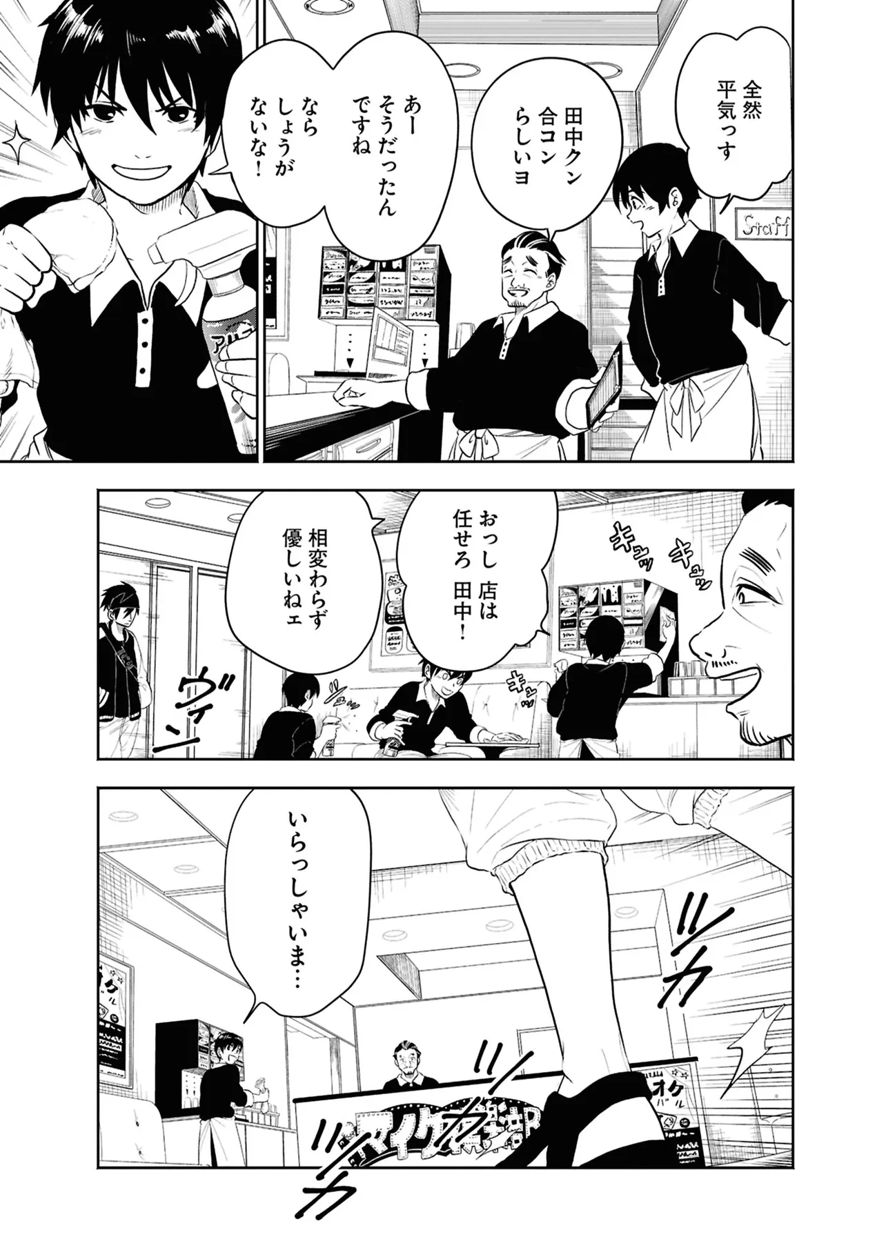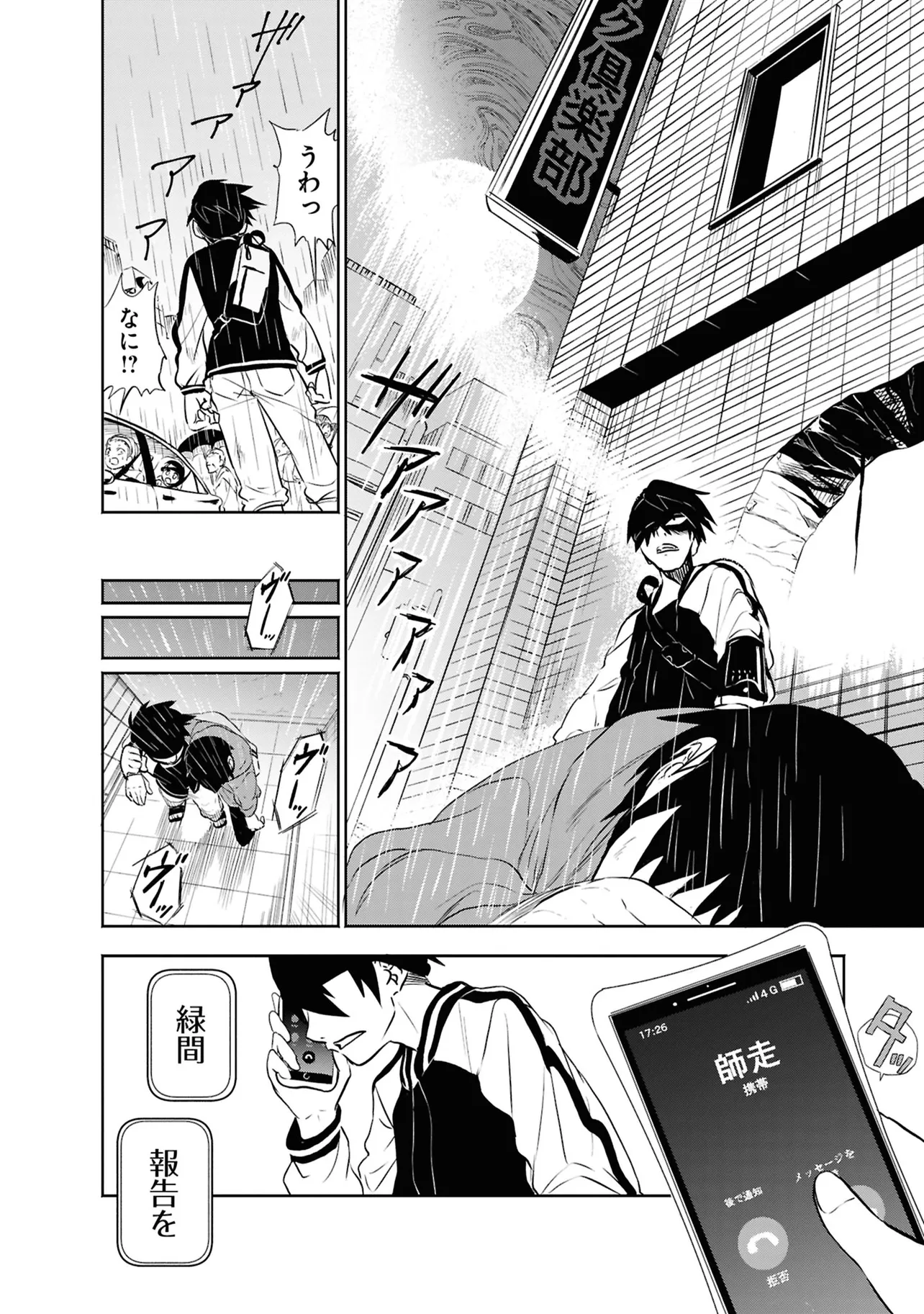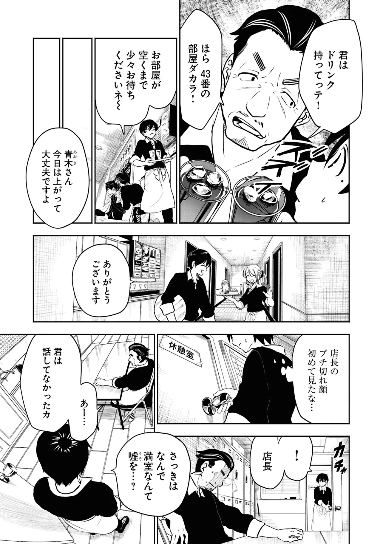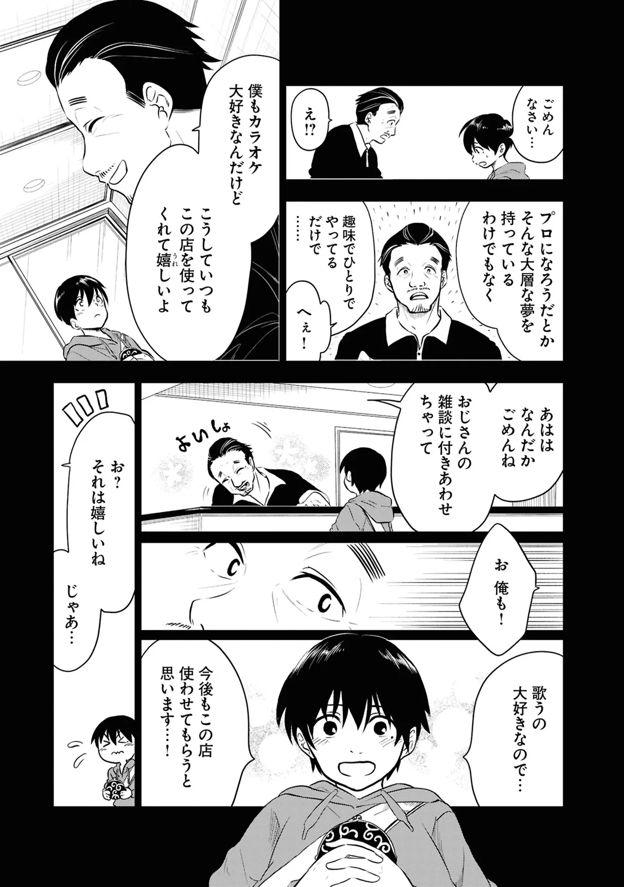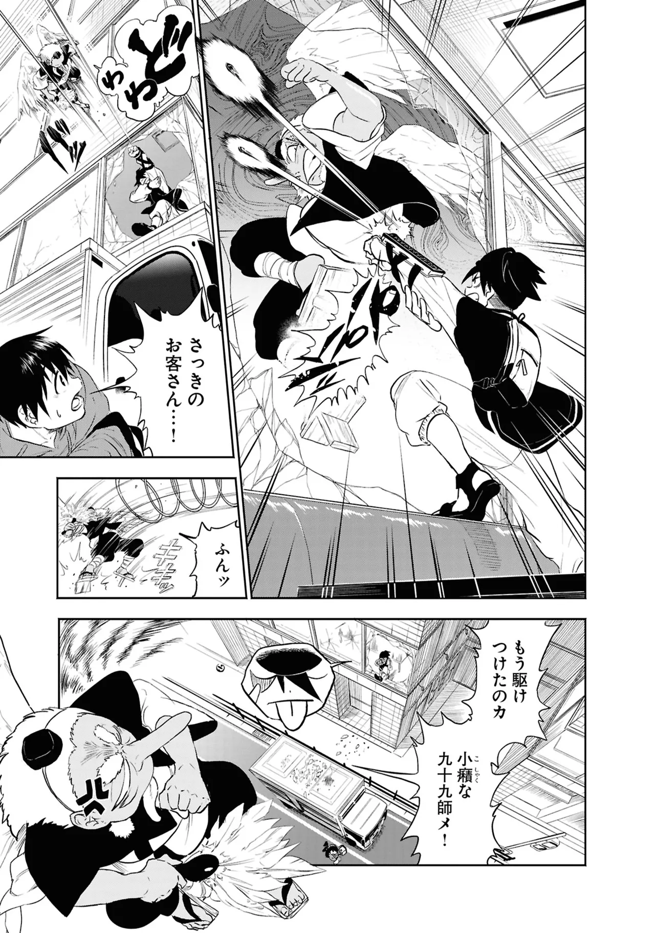 数日前に失踪事件が起こったカラオケ店。 そこでバイトする青木時也はさらなる奇怪な事件に巻きこまれていく。 一方、失踪事件を調査する緑間はその犯人に目星をつけるが正体がわからないままでいた…。 ゲーム実況者「White Tails」のメンバーが登場、 九十九師と妖怪の戦いを描く!!