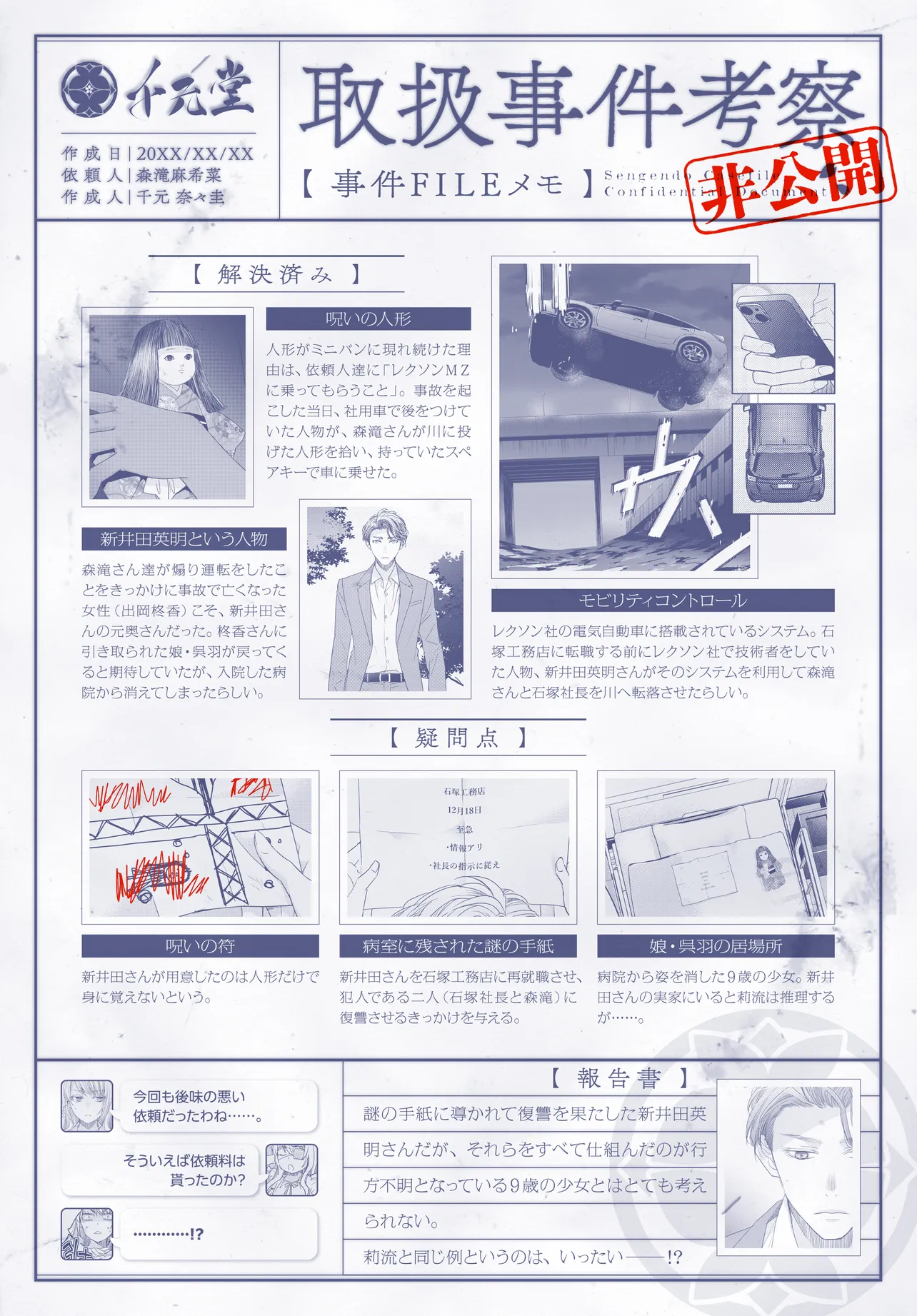 依頼される内容は実際に心霊関係の事件はほとんどなく、いわゆる「ヒトコワ」な現場に遭遇することが多い。相談者の話を聞いて事件の謎を模索する中、助手として引き取った莉流が持つ奇特な才能によって人間が持つドス黒い事件を次々と解決へと導いていく。とても10歳の少女とは思えない落ち着いた言動や考え方、何より犯罪者となる人間の思考を知り尽くしたかのような判断力、……そう彼女の中にはかつて死刑でその身を滅ぼしたシリアルキラーが転生しているのだった。