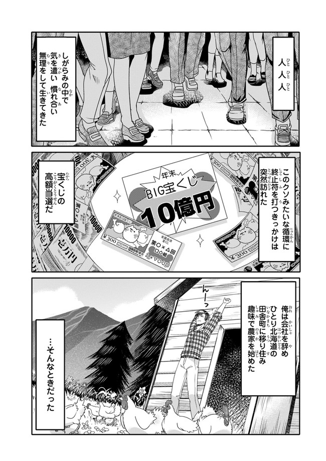 商社マンとして日夜仕事に励む奥田圭吾は、宝くじで10億円に当選。 お金の心配も必要なくなり、天恵が如く手に入れた高額賞金を元手に 人里離れた田舎で悠々自適な独身スローライフを過ごそうとした圭吾だが、 その矢先、突如鶏小屋ごと異世界に転移されてしまい――!? 言葉が通じない異世界でも“元商社マン”スキルでなんのその!? 人間嫌いアラフォーのソロ異世界隠遁ライフ開始!