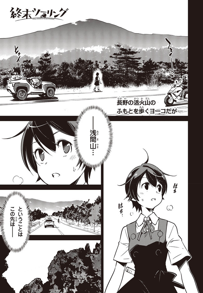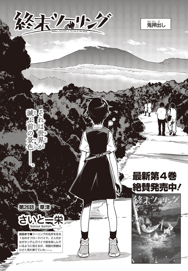 終末ツーリング “第26話 草津①” 終末ツーリング 投稿者 admin - 3年 前に 幸せな読書漫画 終末ツーリング “第26話 草津①” , いいねと共有ボタンをクリックすることを忘れないでください. Manga 終末ツーリング 常に更新されます 無料コミック Comic Top. 他のマンガの更新を読むことを忘れないでください。 マンガコレクションのリスト 無料コミック Comic Top マンガリストメニューにあります. お友達と共有しましょう! Facebook Twitter Pinterest Whatsapp 前のエピソード すべての章 次のエピソード リスト ページング Loading.. 前のエピソード すべての章 次のエピソード リスト ページング お友達と共有しましょう! Facebook Twitter Pinterest Whatsapp お気に入りに追加に続く 4 人 終末ツーリング ツーリングの名所を走る1台のオフロードバイク。 箱根で富士山を眺め、横浜ベイブリッジで釣りをして、有明の東京ビッグサイトへ向かう。 2人の少女がタンデムでバイク旅を楽しんでいるように見えるが周囲の景観はひどく荒れ果てていて――。 誰もいない終末世界を2人の少女がセローでトコトコ駆け回る異色のツーリングコミックがここに開幕! 世界が終わってもバイク旅は終わらない。 さいとー栄(著者) BOOK☆WALKERでセール中!!SFツーリングバイク旅行異世界