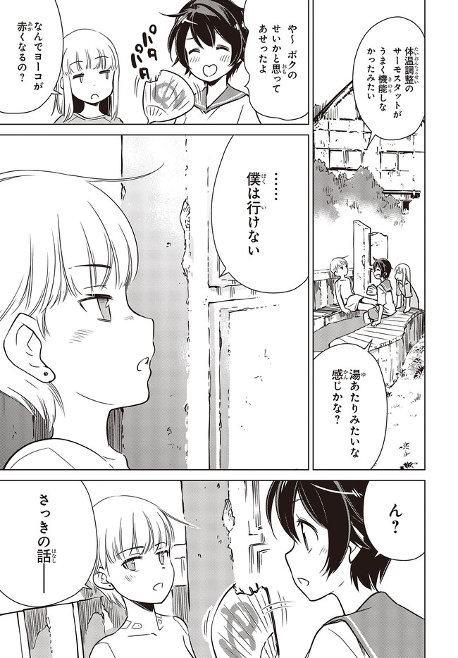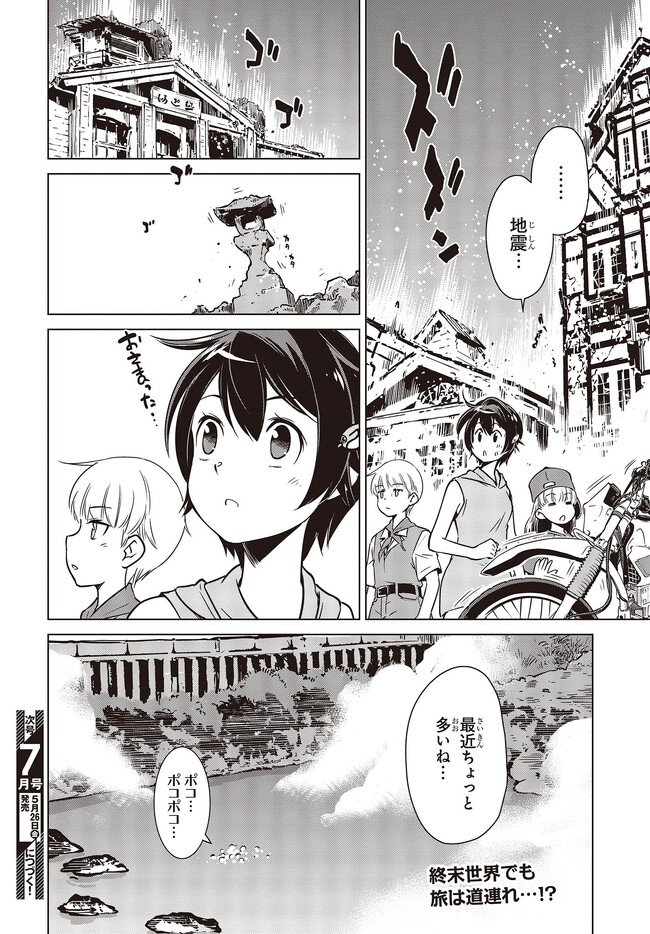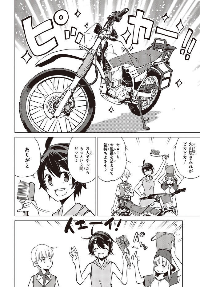 終末ツーリング “第28話 草津その3②” 終末ツーリング 投稿者 admin - 3年 前に 幸せな読書漫画 終末ツーリング “第28話 草津その3②” , いいねと共有ボタンをクリックすることを忘れないでください. Manga 終末ツーリング 常に更新されます 無料コミック Comic Top. 他のマンガの更新を読むことを忘れないでください。 マンガコレクションのリスト 無料コミック Comic Top マンガリストメニューにあります. お友達と共有しましょう! Facebook Twitter Pinterest Whatsapp 前のエピソード すべての章 次のエピソード リスト ページング Loading.. 前のエピソード すべての章 次のエピソード リスト ページング お友達と共有しましょう! Facebook Twitter Pinterest Whatsapp お気に入りに追加に続く 4 人 終末ツーリング ツーリングの名所を走る1台のオフロードバイク。 箱根で富士山を眺め、横浜ベイブリッジで釣りをして、有明の東京ビッグサイトへ向かう。 2人の少女がタンデムでバイク旅を楽しんでいるように見えるが周囲の景観はひどく荒れ果てていて――。 誰もいない終末世界を2人の少女がセローでトコトコ駆け回る異色のツーリングコミックがここに開幕! 世界が終わってもバイク旅は終わらない。 さいとー栄(著者) BOOK☆WALKERでセール中!!SFツーリングバイク旅行異世界