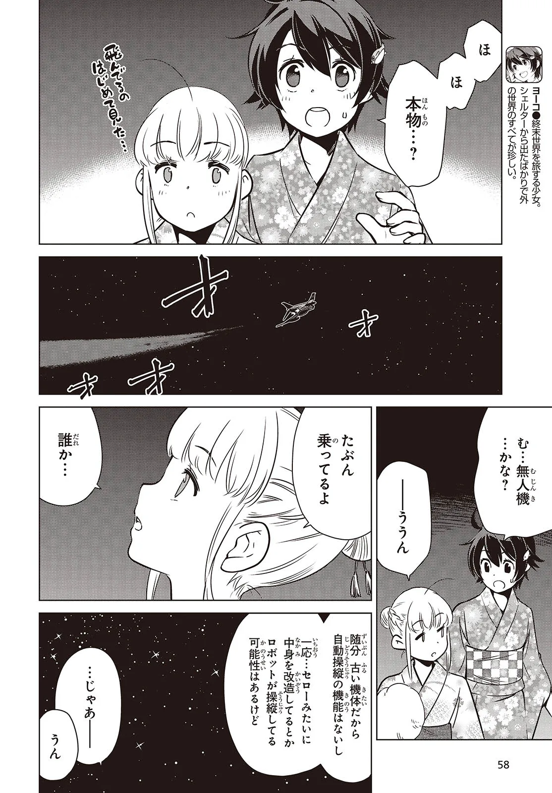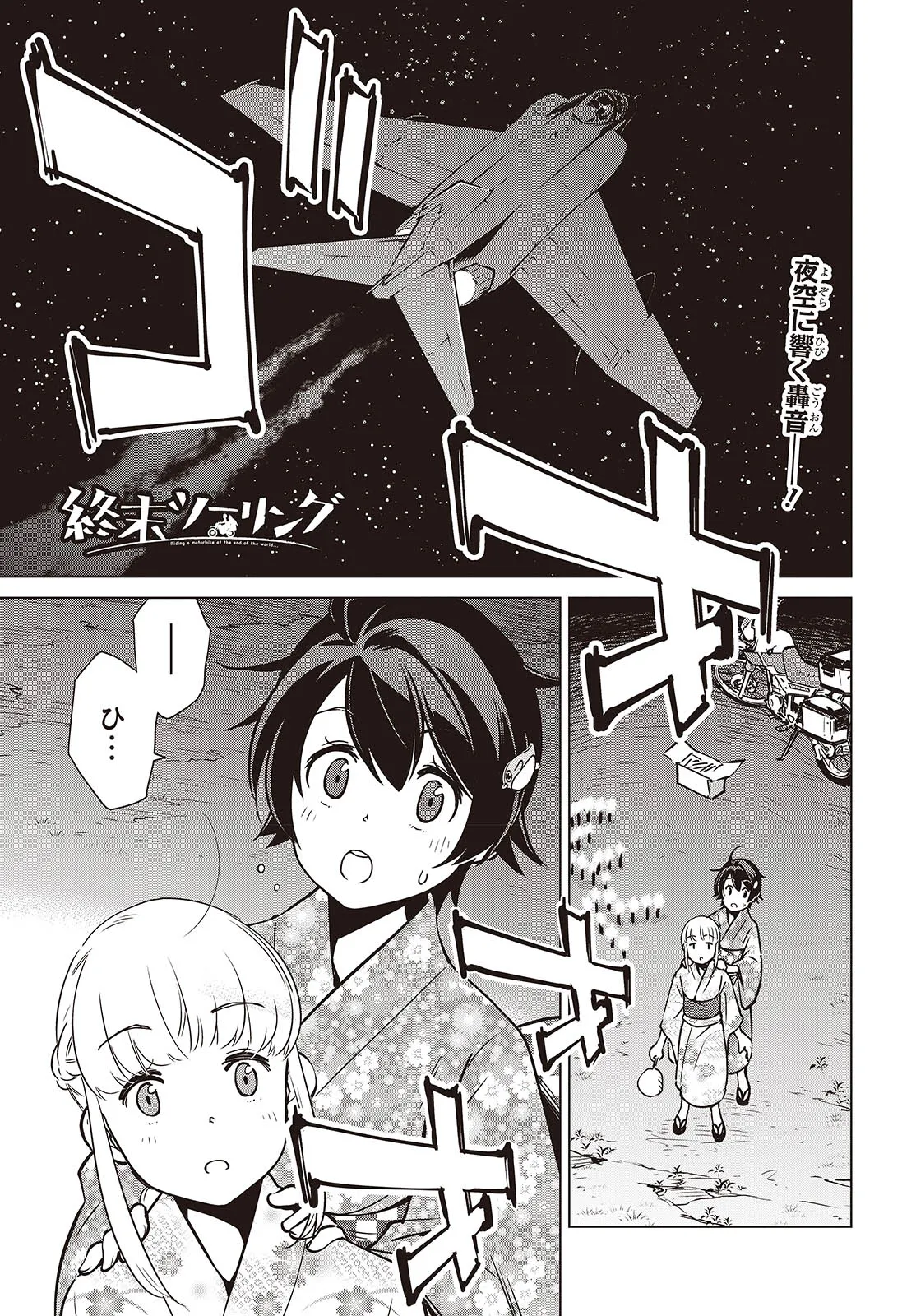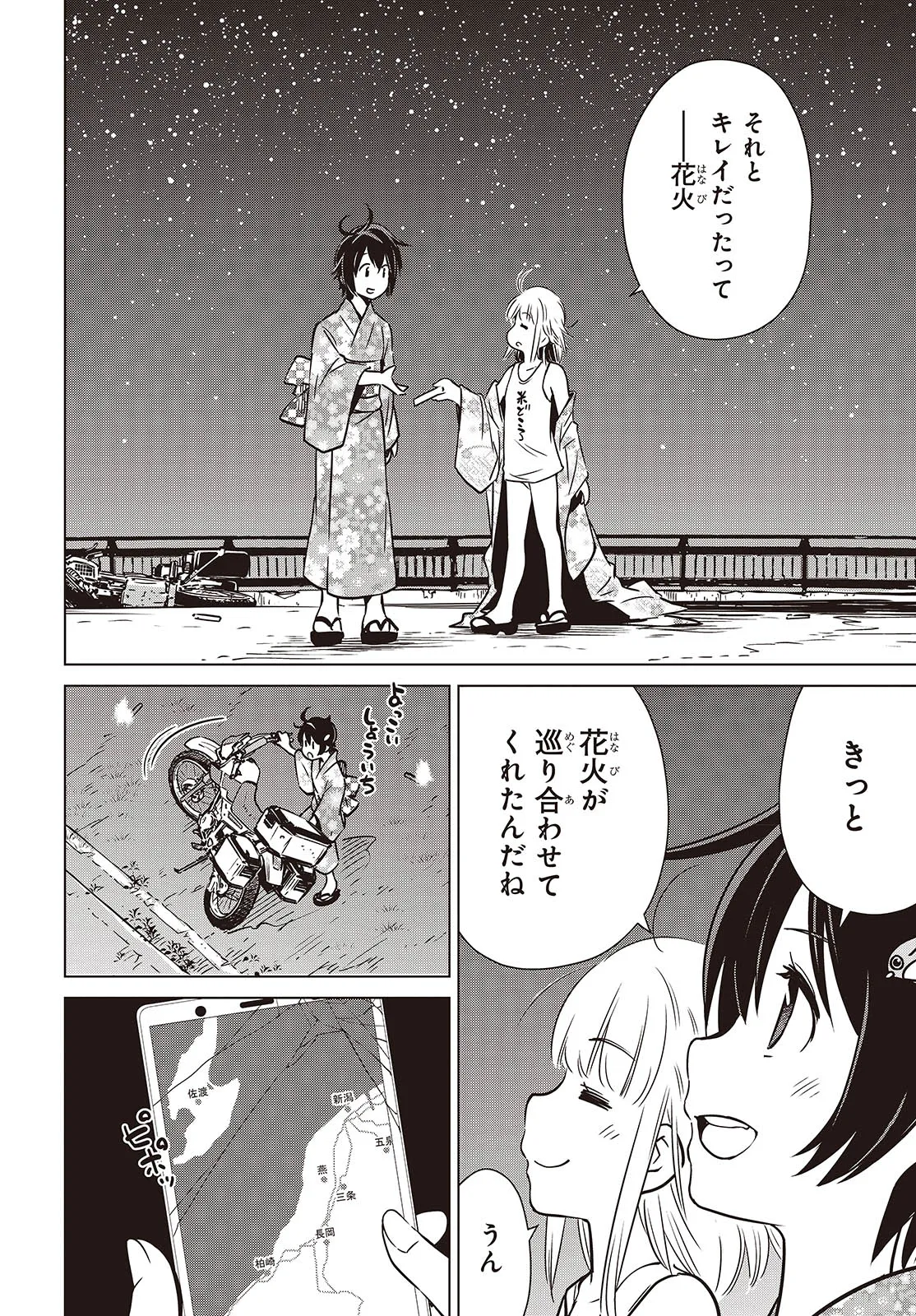 終末ツーリング “第39話 長岡その3” 終末ツーリング 投稿者 admin - 1年 前に 幸せな読書漫画 終末ツーリング “第39話 長岡その3” , いいねと共有ボタンをクリックすることを忘れないでください. Manga 終末ツーリング 常に更新されます 無料コミック Comic Top. 他のマンガの更新を読むことを忘れないでください。 マンガコレクションのリスト 無料コミック Comic Top マンガリストメニューにあります. お友達と共有しましょう! Facebook Twitter Pinterest Whatsapp 前のエピソード すべての章 次のエピソード リスト ページング Loading.. 前のエピソード すべての章 次のエピソード リスト ページング お友達と共有しましょう! Facebook Twitter Pinterest Whatsapp お気に入りに追加に続く 4 人 終末ツーリング ツーリングの名所を走る1台のオフロードバイク。 箱根で富士山を眺め、横浜ベイブリッジで釣りをして、有明の東京ビッグサイトへ向かう。 2人の少女がタンデムでバイク旅を楽しんでいるように見えるが周囲の景観はひどく荒れ果てていて――。 誰もいない終末世界を2人の少女がセローでトコトコ駆け回る異色のツーリングコミックがここに開幕! 世界が終わってもバイク旅は終わらない。 さいとー栄(著者) BOOK☆WALKERでセール中!!SFツーリングバイク旅行異世界