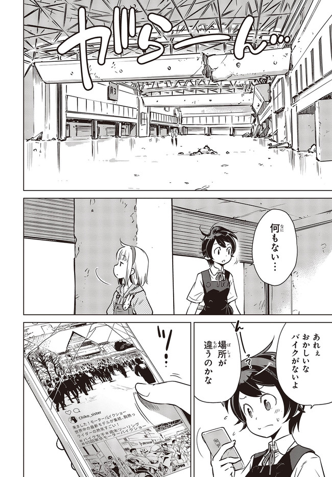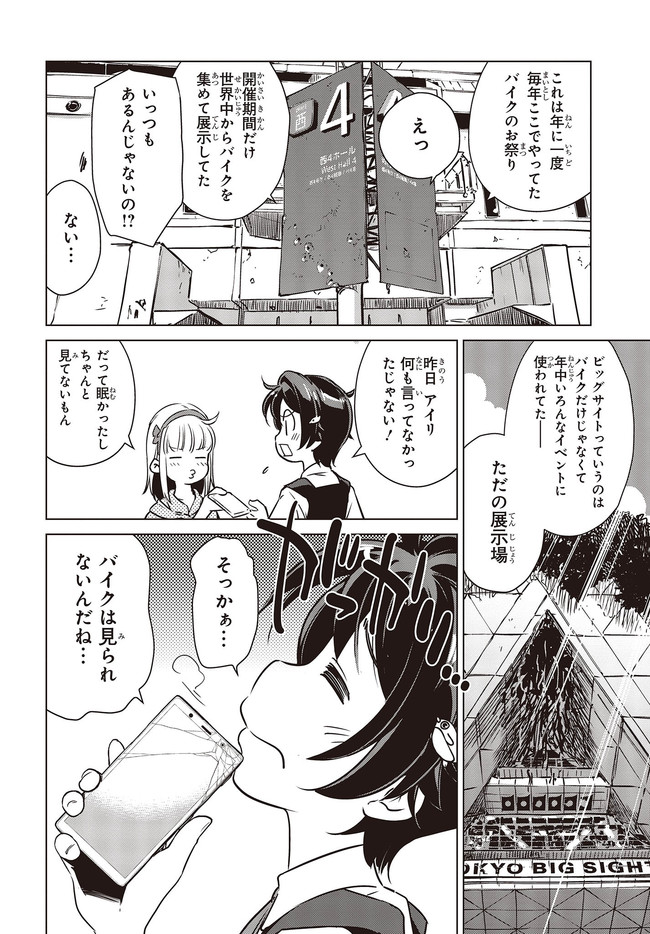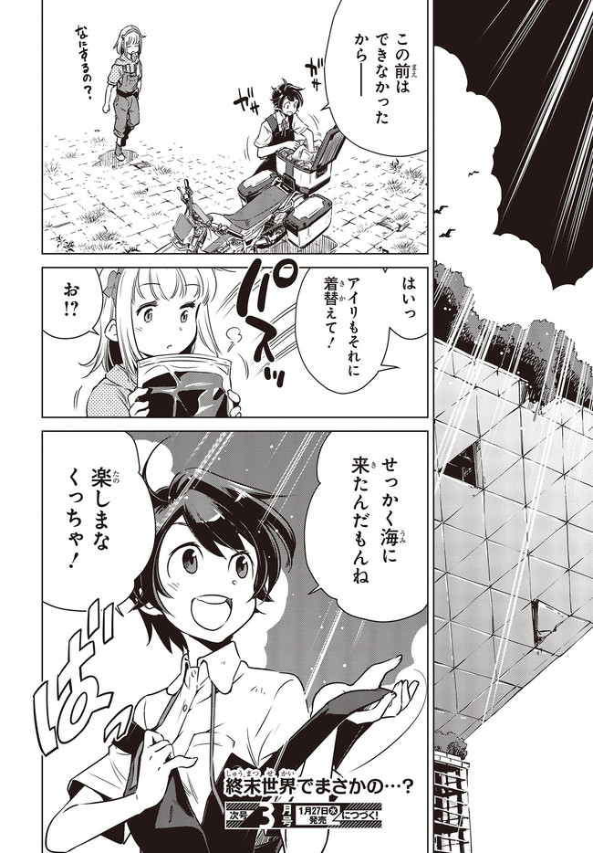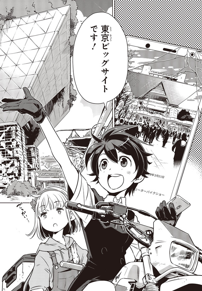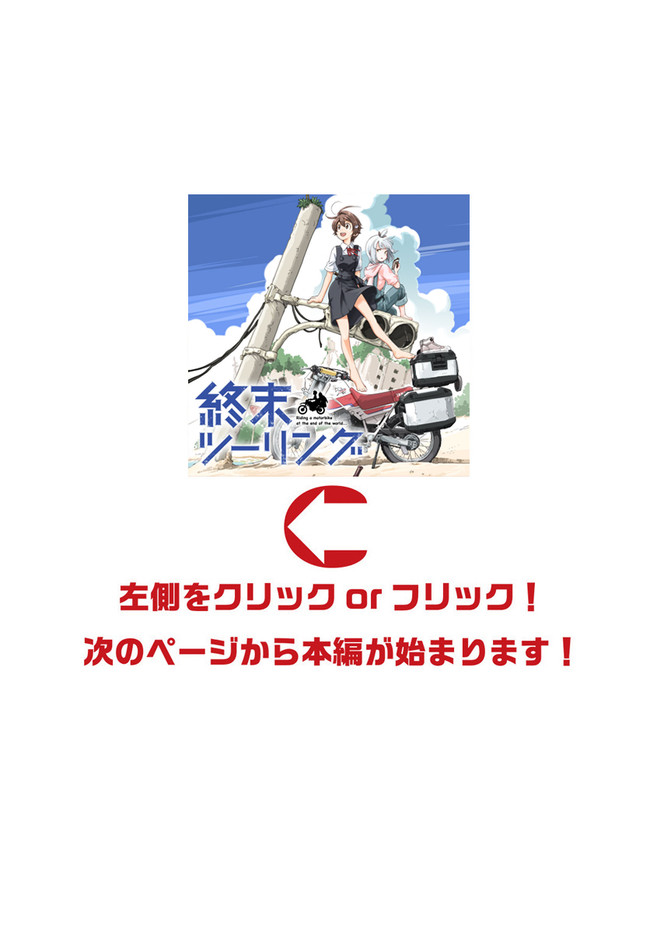 終末ツーリング “第4話 東京ビッグサイト 前編②” 終末ツーリング 投稿者 admin - 3年 前に 幸せな読書漫画 終末ツーリング “第4話 東京ビッグサイト 前編②” , いいねと共有ボタンをクリックすることを忘れないでください. Manga 終末ツーリング 常に更新されます 無料コミック Comic Top. 他のマンガの更新を読むことを忘れないでください。 マンガコレクションのリスト 無料コミック Comic Top マンガリストメニューにあります. お友達と共有しましょう! Facebook Twitter Pinterest Whatsapp 前のエピソード すべての章 次のエピソード リスト ページング Loading.. 前のエピソード すべての章 次のエピソード リスト ページング お友達と共有しましょう! Facebook Twitter Pinterest Whatsapp お気に入りに追加に続く 4 人 終末ツーリング ツーリングの名所を走る1台のオフロードバイク。 箱根で富士山を眺め、横浜ベイブリッジで釣りをして、有明の東京ビッグサイトへ向かう。 2人の少女がタンデムでバイク旅を楽しんでいるように見えるが周囲の景観はひどく荒れ果てていて――。 誰もいない終末世界を2人の少女がセローでトコトコ駆け回る異色のツーリングコミックがここに開幕! 世界が終わってもバイク旅は終わらない。 さいとー栄(著者) BOOK☆WALKERでセール中!!SFツーリングバイク旅行異世界