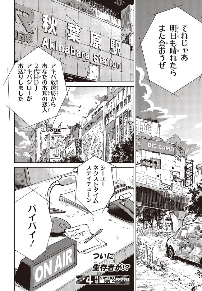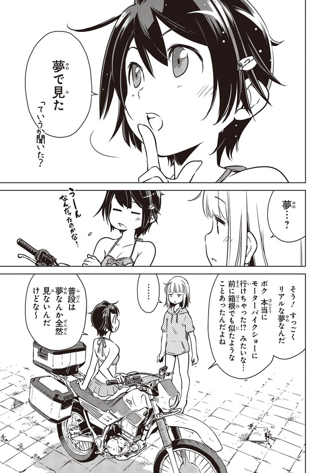 終末ツーリング “第5話 東京ビッグサイト 後編④” 終末ツーリング 投稿者 admin - 3年 前に 幸せな読書漫画 終末ツーリング “第5話 東京ビッグサイト 後編④” , いいねと共有ボタンをクリックすることを忘れないでください. Manga 終末ツーリング 常に更新されます 無料コミック Comic Top. 他のマンガの更新を読むことを忘れないでください。 マンガコレクションのリスト 無料コミック Comic Top マンガリストメニューにあります. お友達と共有しましょう! Facebook Twitter Pinterest Whatsapp 前のエピソード すべての章 次のエピソード リスト ページング Loading.. 前のエピソード すべての章 次のエピソード リスト ページング お友達と共有しましょう! Facebook Twitter Pinterest Whatsapp お気に入りに追加に続く 4 人 終末ツーリング ツーリングの名所を走る1台のオフロードバイク。 箱根で富士山を眺め、横浜ベイブリッジで釣りをして、有明の東京ビッグサイトへ向かう。 2人の少女がタンデムでバイク旅を楽しんでいるように見えるが周囲の景観はひどく荒れ果てていて――。 誰もいない終末世界を2人の少女がセローでトコトコ駆け回る異色のツーリングコミックがここに開幕! 世界が終わってもバイク旅は終わらない。 さいとー栄(著者) BOOK☆WALKERでセール中!!SFツーリングバイク旅行異世界