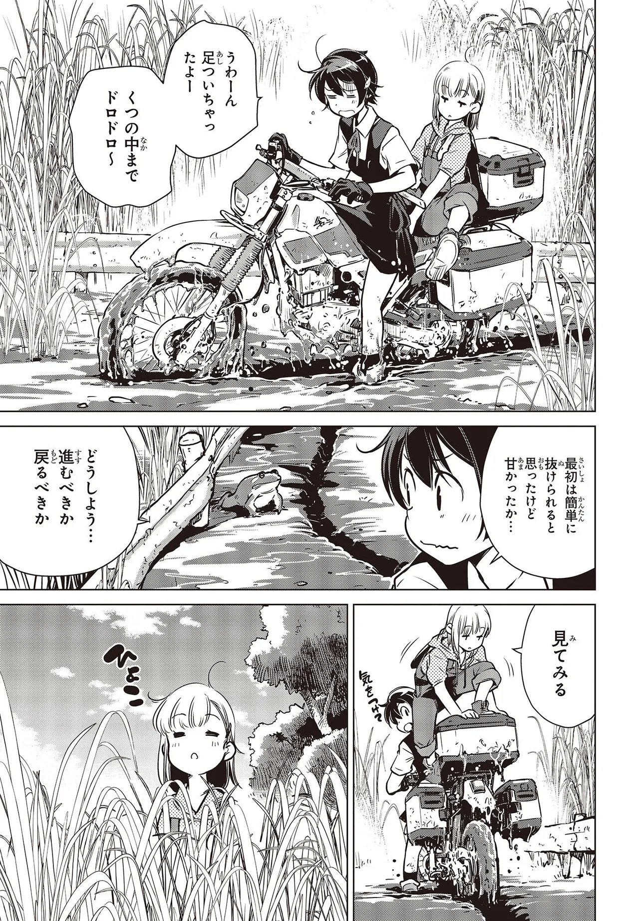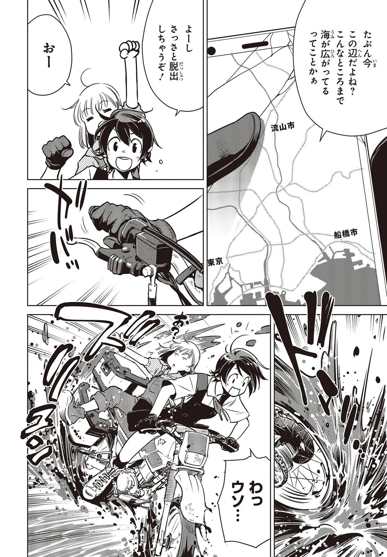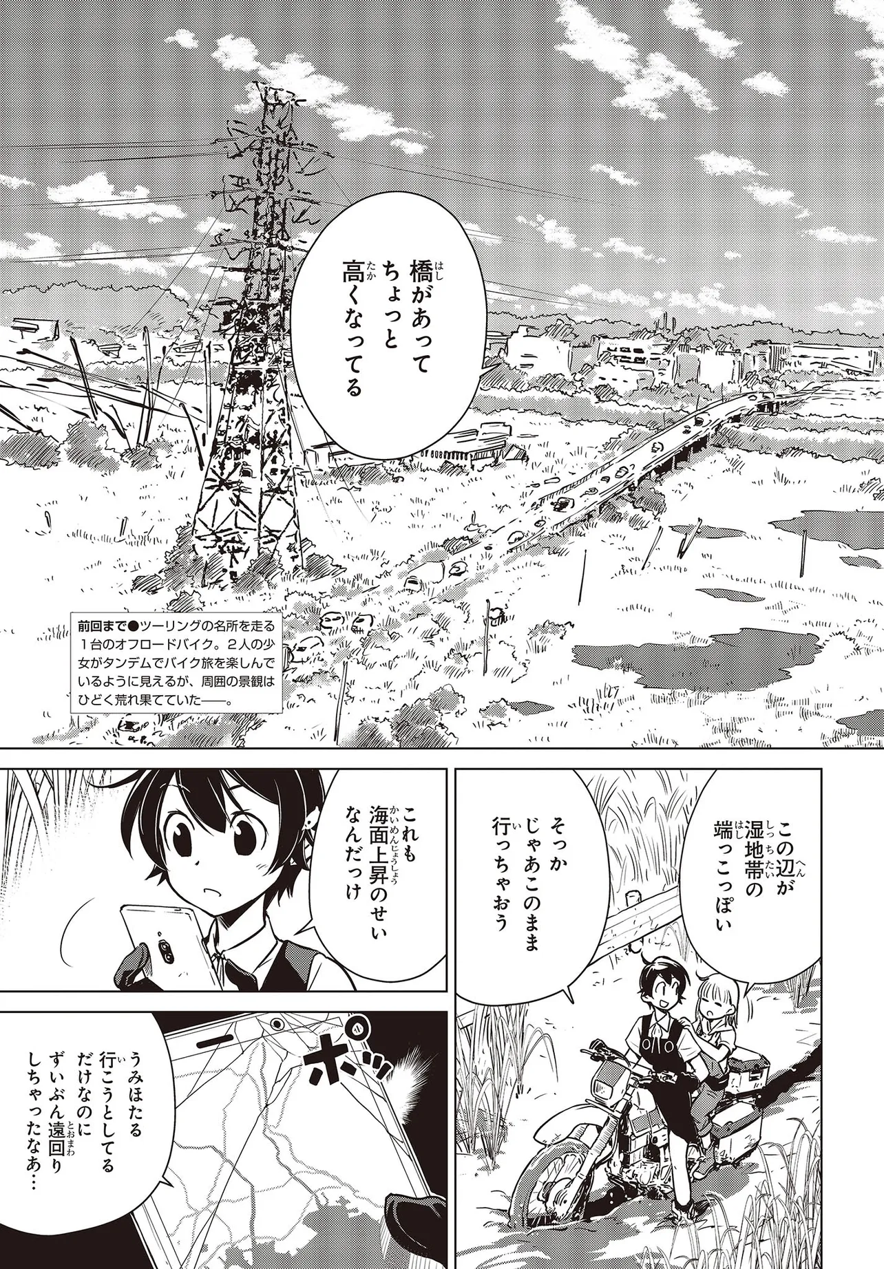 終末ツーリング 第8話 千葉 流山① 終末ツーリング 投稿者 admin - 4か月 前に 幸せな読書漫画 終末ツーリング 第8話 千葉 流山① , いいねと共有ボタンをクリックすることを忘れないでください. Manga 終末ツーリング 常に更新されます 無料コミック Comic Top. 他のマンガの更新を読むことを忘れないでください。 マンガコレクションのリスト 無料コミック Comic Top マンガリストメニューにあります. お友達と共有しましょう! Facebook Twitter Pinterest Whatsapp 前のエピソード すべての章 次のエピソード リスト ページング Loading.. 前のエピソード すべての章 次のエピソード リスト ページング お友達と共有しましょう! Facebook Twitter Pinterest Whatsapp お気に入りに追加に続く 4 人 終末ツーリング ツーリングの名所を走る1台のオフロードバイク。 箱根で富士山を眺め、横浜ベイブリッジで釣りをして、有明の東京ビッグサイトへ向かう。 2人の少女がタンデムでバイク旅を楽しんでいるように見えるが周囲の景観はひどく荒れ果てていて――。 誰もいない終末世界を2人の少女がセローでトコトコ駆け回る異色のツーリングコミックがここに開幕! 世界が終わってもバイク旅は終わらない。 さいとー栄(著者) BOOK☆WALKERでセール中!!SFツーリングバイク旅行異世界