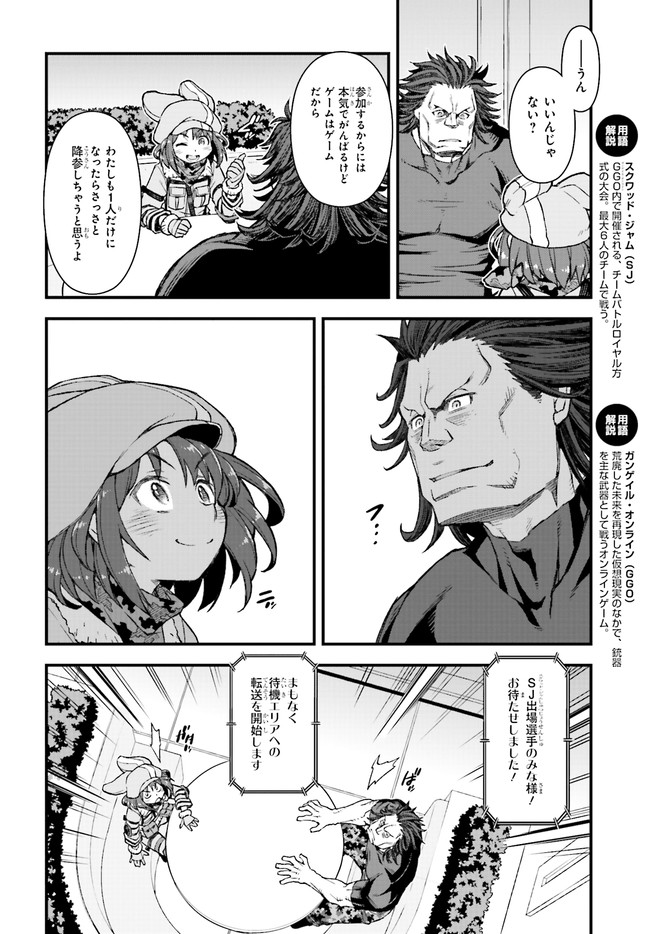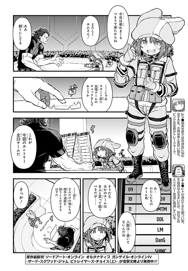 『ソードアート・オンライン』(SAO)の世界設定をもとに作り上げられたスピンアウト小説『ソードアート・オンライン オルタナティブ ガンゲイル・オンライン』をコミカライズ!物語の舞台となるのは、『SAO』の《ファントム・バレット編》のなかで描かれたVR(ヴァーチャルリアリティ)ゲーム、《ガンゲイル・オンライン》。このゲームでは、戦争により荒廃した未来世界にダイブしたプレイヤーが、銃火器を武器にモンスターやほかのプレイヤーと戦っていく。主人公は、そんな殺伐としたゲームとは無縁の生活を送っていた女子大生・小比類巻香蓮。長身がコンプレックスの彼女は、《ガンゲイル・オンライン》でかわいくて小柄なアバター(ゲーム中のキャラクター)を手に入れたことから、もう1人の自分「レン」として、ゲームの世界での生活を楽しむようになる。そして、いつしかチーム対抗のバトルロイヤル戦《スクワット・ジャム》に参加することになり……!?