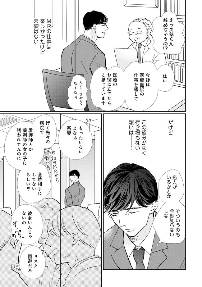 スモークブルーの雨のち晴れ 第27話 スモークブルーの雨のち晴れ 投稿者 admin - 1年 前に 幸せな読書漫画 スモークブルーの雨のち晴れ 第27話 , いいねと共有ボタンをクリックすることを忘れないでください. Manga スモークブルーの雨のち晴れ 常に更新されます 無料コミック Comic Top. 他のマンガの更新を読むことを忘れないでください。 マンガコレクションのリスト 無料コミック Comic Top マンガリストメニューにあります. お友達と共有しましょう! Facebook Twitter Pinterest Whatsapp 前のエピソード すべての章 次のエピソード リスト ページング Loading.. 前のエピソード すべての章 次のエピソード リスト ページング お友達と共有しましょう! Facebook Twitter Pinterest Whatsapp お気に入りに追加に続く 1 人 スモークブルーの雨のち晴れ 危うい夜遊びをしていた朔太郎を助けたのは、元同僚でNo.1の売上を誇ったライバル・久慈静。 朔太郎よりも一足早く久慈が退職した際は、きっと輝かしいセカンドキャリアがあるのだろうと羨望の目で見られていた。 しかし、6年ぶりに再会した久慈は、嫌味な性格はそのままだが、気だるげな長髪姿でなぜか翻訳の仕事をしていて――。 波真田かもめ(著者) 30代受け30代攻めforgirlsケンカップルほだされ受けライバル強気攻め男の子の事情翻訳家長髪攻め黒髪攻め
