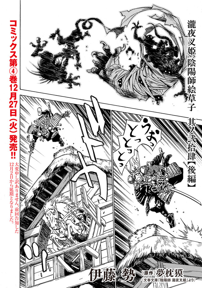 瀧夜叉姫 陰陽師絵草子 其ノ弐拾肆話【後編】 瀧夜叉姫 陰陽師絵草子 投稿者 admin - 3年 前に 幸せな読書漫画 瀧夜叉姫 陰陽師絵草子 其ノ弐拾肆話【後編】 , いいねと共有ボタンをクリックすることを忘れないでください. Manga 瀧夜叉姫 陰陽師絵草子 常に更新されます 無料コミック Comic Top. 他のマンガの更新を読むことを忘れないでください。 マンガコレクションのリスト 無料コミック Comic Top マンガリストメニューにあります. お友達と共有しましょう! Facebook Twitter Pinterest Whatsapp 前のエピソード すべての章 次のエピソード リスト ページング Loading.. 前のエピソード すべての章 次のエピソード リスト ページング お友達と共有しましょう! Facebook Twitter Pinterest Whatsapp お気に入りに追加に続く 0 人 瀧夜叉姫 陰陽師絵草子 天徳四年(西暦960年)春。天文得業生・安倍晴明と、醍醐天皇の孫である源博雅は、晴明の兄弟子にして上司である陰陽頭・賀茂保憲からある仕事を頼まれる。その仕事とは、参議・小野好古鄕の屋敷に押し入った「盗らずの盗人」に関する不可解な事件にまつわるものだった--。 映画化、ドラマ化もされた夢枕獏の大ヒット小説『陰陽師』。シリーズ屈指の人気エピソード「瀧夜叉姫」を、『荒野に獣慟哭す』、『闇狩り師 キマイラ天龍変』、『天竺熱風録』の伊藤勢が、圧倒的筆致で描く!! 伊藤勢(漫画)夢枕獏(原作) #コミックHuストーリードラマ化伝奇歴史