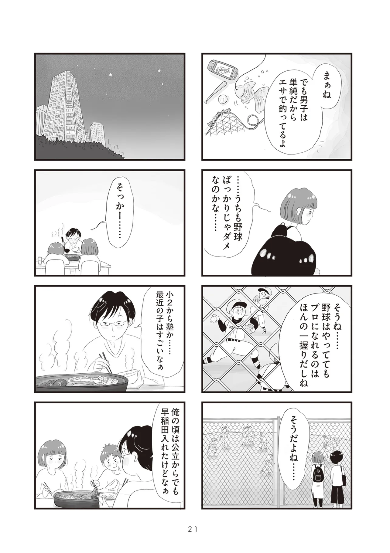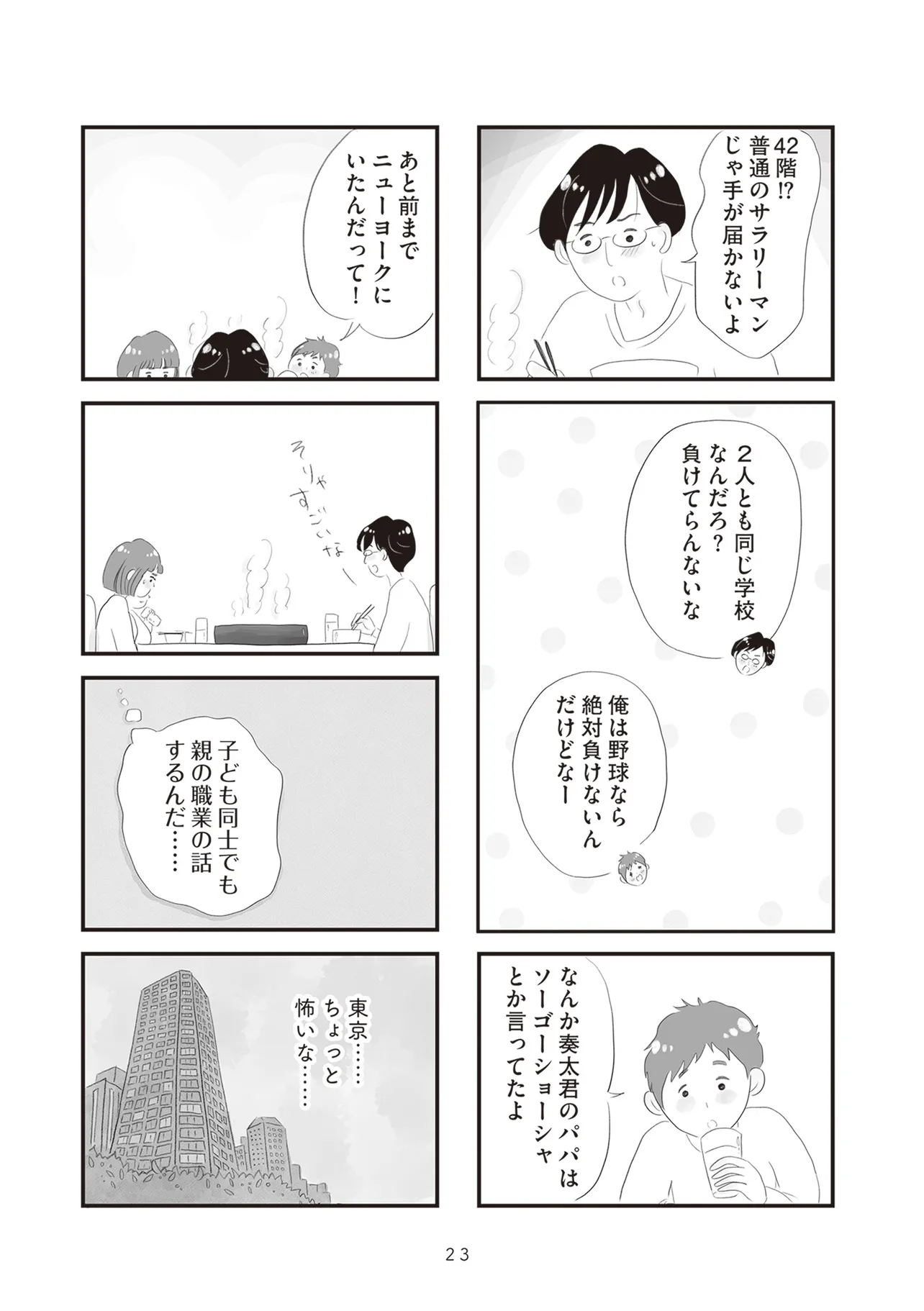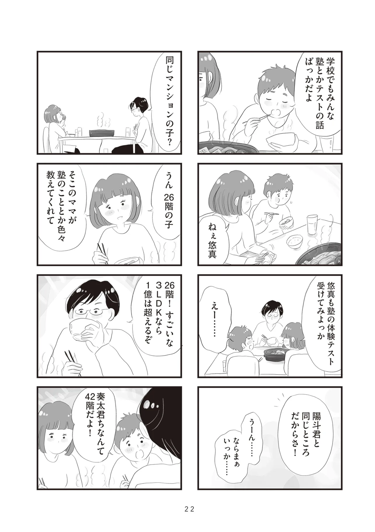 低層階と高層階、専業主婦とバリキャリ、子どもの学力、夫の職業など、さまざまな軸で見えない競争意識に駆り立てられていく大人たち。同じタワマンの低・中・高層階に住む家族3組の虚栄と内情を描くセミフィクション。
