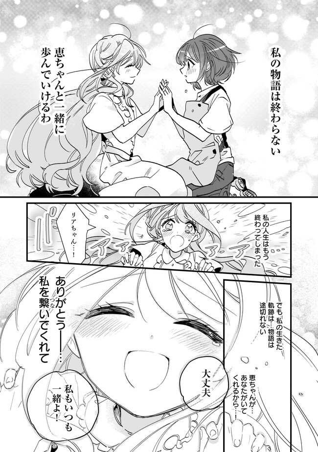高校生のめぐみさんは、花屋さんを手伝いながらトラックにひかれて命を落とします。目覚めためぐみの前には異世界の女神光輪が立ち、横には別の少女スリアが立っていた。