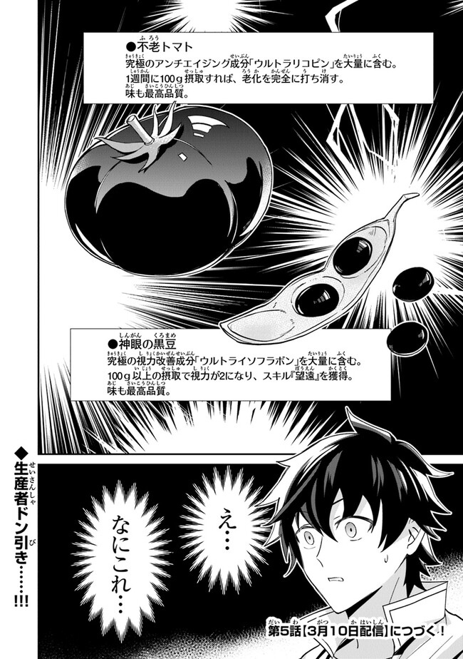 仲間達と夢だった自給自足生活を始めると菜園で出来る作物は味も最高級、しかも不老や視力強化などトンデモ効果つき!!