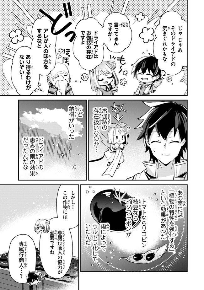 異世界転生してしまった元社畜のマサト。ひょんなことから植物に恵みをもたらす妖精・ドライアドを大勢テイムしてしまい、全ステータスが爆上がり! その圧倒的な力でドラゴンも仲間にしてしまう。 仲間達と夢だった自給自足生活を始めると菜園で出来る作物は味も最高級、しかも不老や視力強化などトンデモ効果つき!! スキルで建てた工場ではビールや醤油まで作れてしまい!? 無自覚最強主人公のぶっとび農業スローライフ開幕!