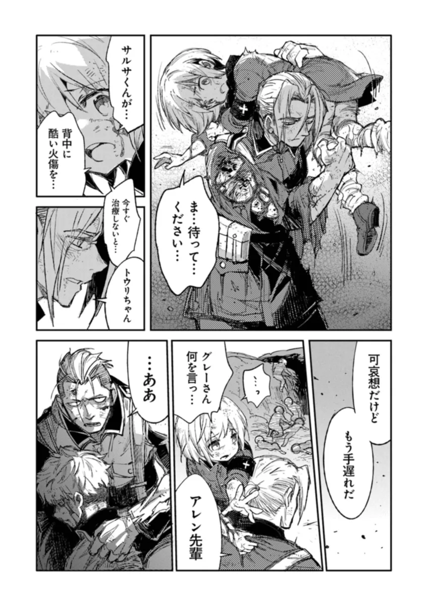 FPSの元プロゲーマー♂が転生した世界は魔法が存在するファンタジー世界だった――が、そこには夢広がる冒険はなく、銃弾が飛び交う泥沼の戦場が待っていた! しかも、トウリ・ノエルという名の孤児の「少女」として……!? トウリは回復魔法への適性を見出され、生まれ育った孤児院への資金援助のため軍に志願し二等衛生兵となる。しかし魔法の訓練も受けないまま、彼女は最も過酷な戦闘が繰り広げられている「西部戦線」の突撃部隊へと配属されてしまう。 彼女に与えられた任務は戦線のエースであるガーバックの専属衛生兵となり、絶対に彼を死なせないこと。けれどガーバックは部下を見殺しにしてでも戦果を上げる最低の指揮官でもあった! 理不尽な命令と暴力が飛び交う戦場で、トウリはただ生き残るために奮闘するが――。