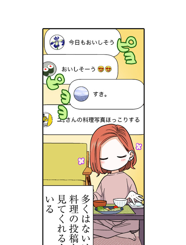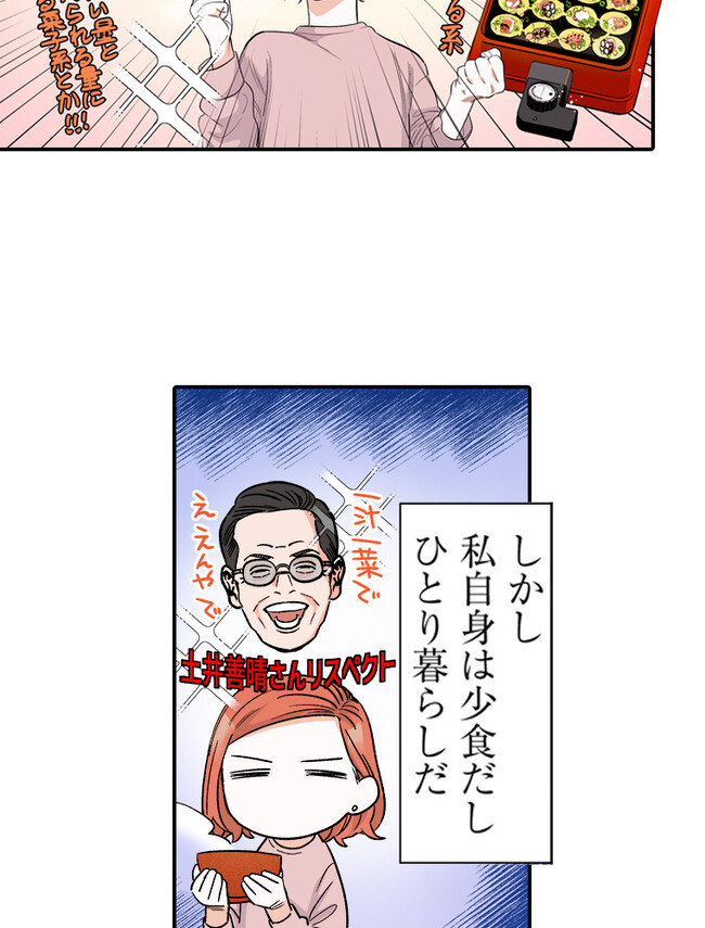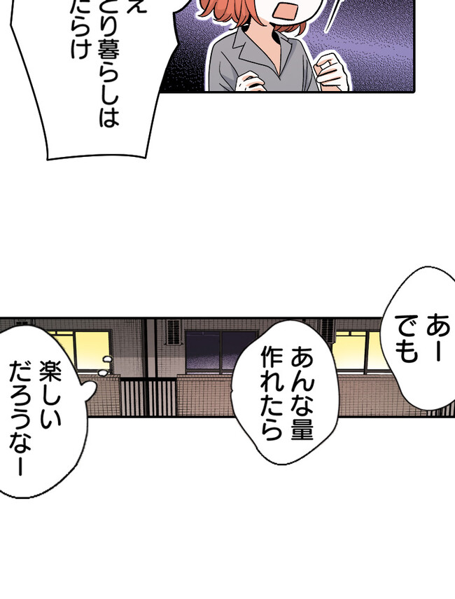 ひとり暮らしで少食だし、作ったところで食べきれない。 でも、本当はもっと作りたい!  料理が大好きな野本さんは、そんな想いと職場のストレスから、 うっかり一人で食べきれないほどご飯を作ってしまう。 そんなとき、お隣のお隣に住む春日さんのことを思い出して 勇気を出して夕食に誘ってみると…?