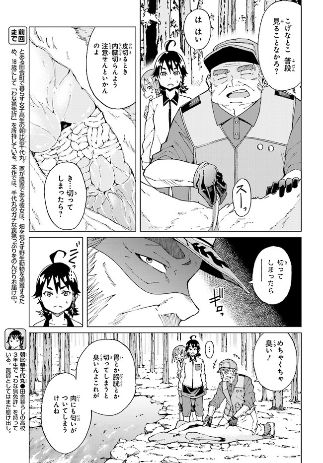 とある田舎町で暮らす女子高生の朝比奈千代丸。家が農家である彼女は、畑を荒らす野生動物を捕獲するため、18歳にして「わな猟免許」を所持している。本作では、動物とのガチな知恵比べが展開する千代丸のリアルな罠猟っぷりをのんびりとお届けしていきます。
