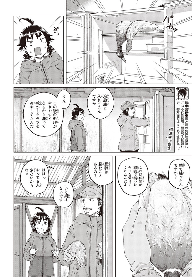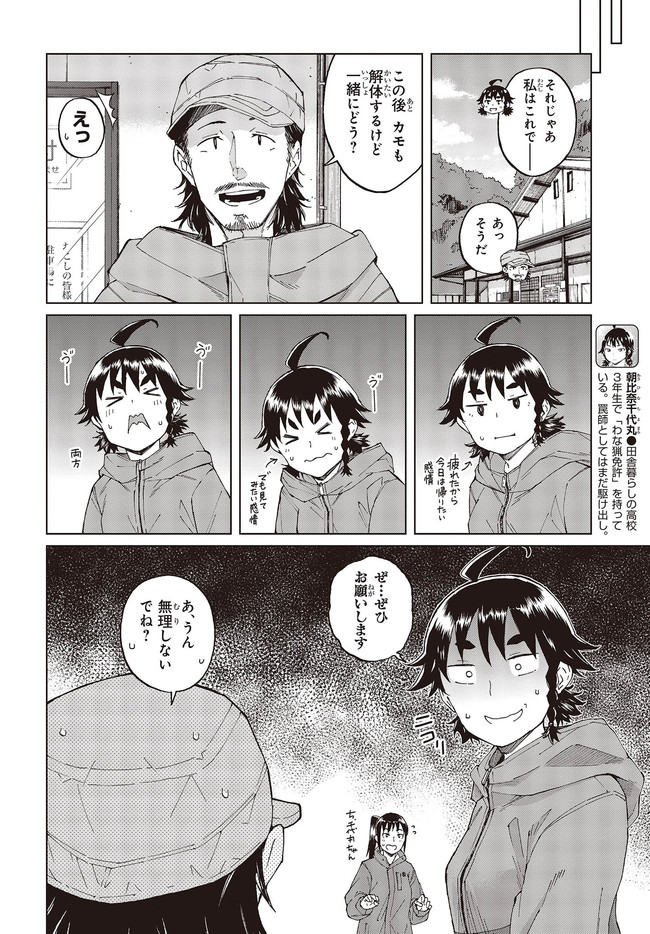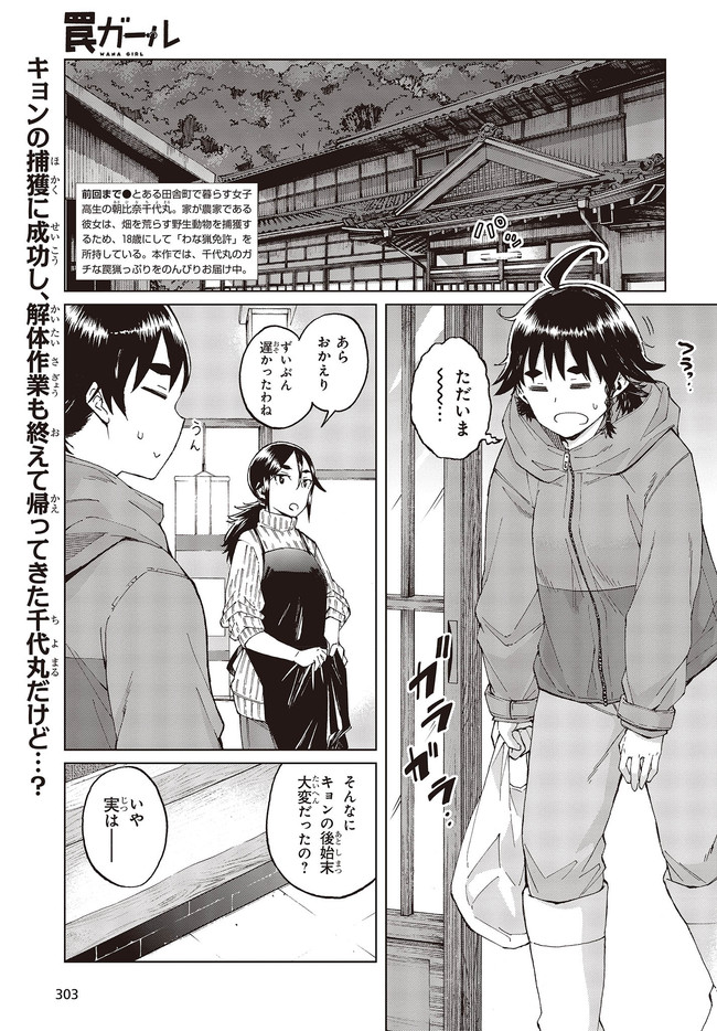 とある田舎町で暮らす女子高生の朝比奈千代丸。家が農家である彼女は、畑を荒らす野生動物を捕獲するため、18歳にして「わな猟免許」を所持している。本作では、動物とのガチな知恵比べが展開する千代丸のリアルな罠猟っぷりをのんびりとお届けしていきます。