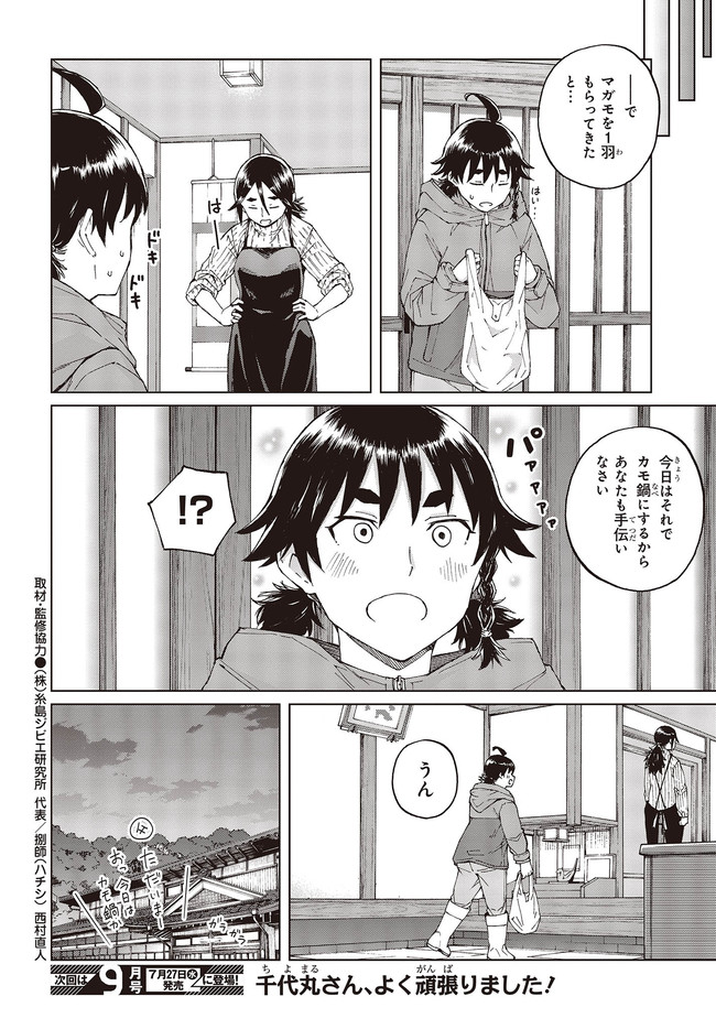とある田舎町で暮らす女子高生の朝比奈千代丸。家が農家である彼女は、畑を荒らす野生動物を捕獲するため、18歳にして「わな猟免許」を所持している。本作では、動物とのガチな知恵比べが展開する千代丸のリアルな罠猟っぷりをのんびりとお届けしていきます。
