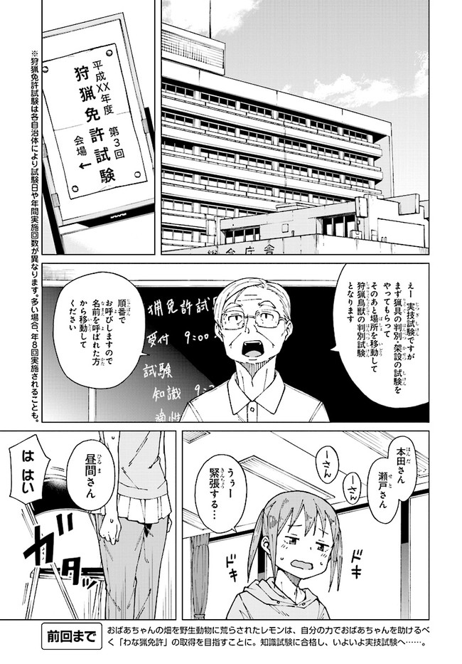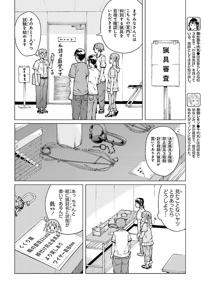 とある田舎町で暮らす女子高生の朝比奈千代丸。家が農家である彼女は、畑を荒らす野生動物を捕獲するため、18歳にして「わな猟免許」を所持している。本作では、動物とのガチな知恵比べが展開する千代丸のリアルな罠猟っぷりをのんびりとお届けしていきます。