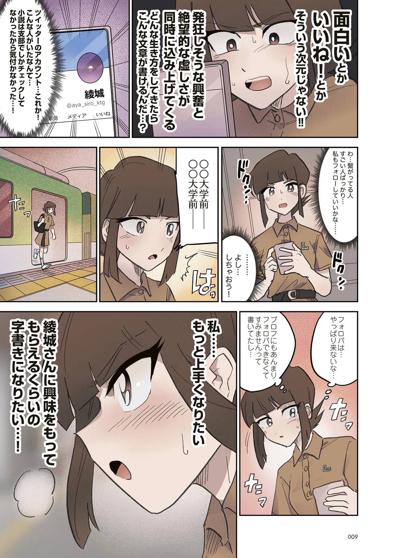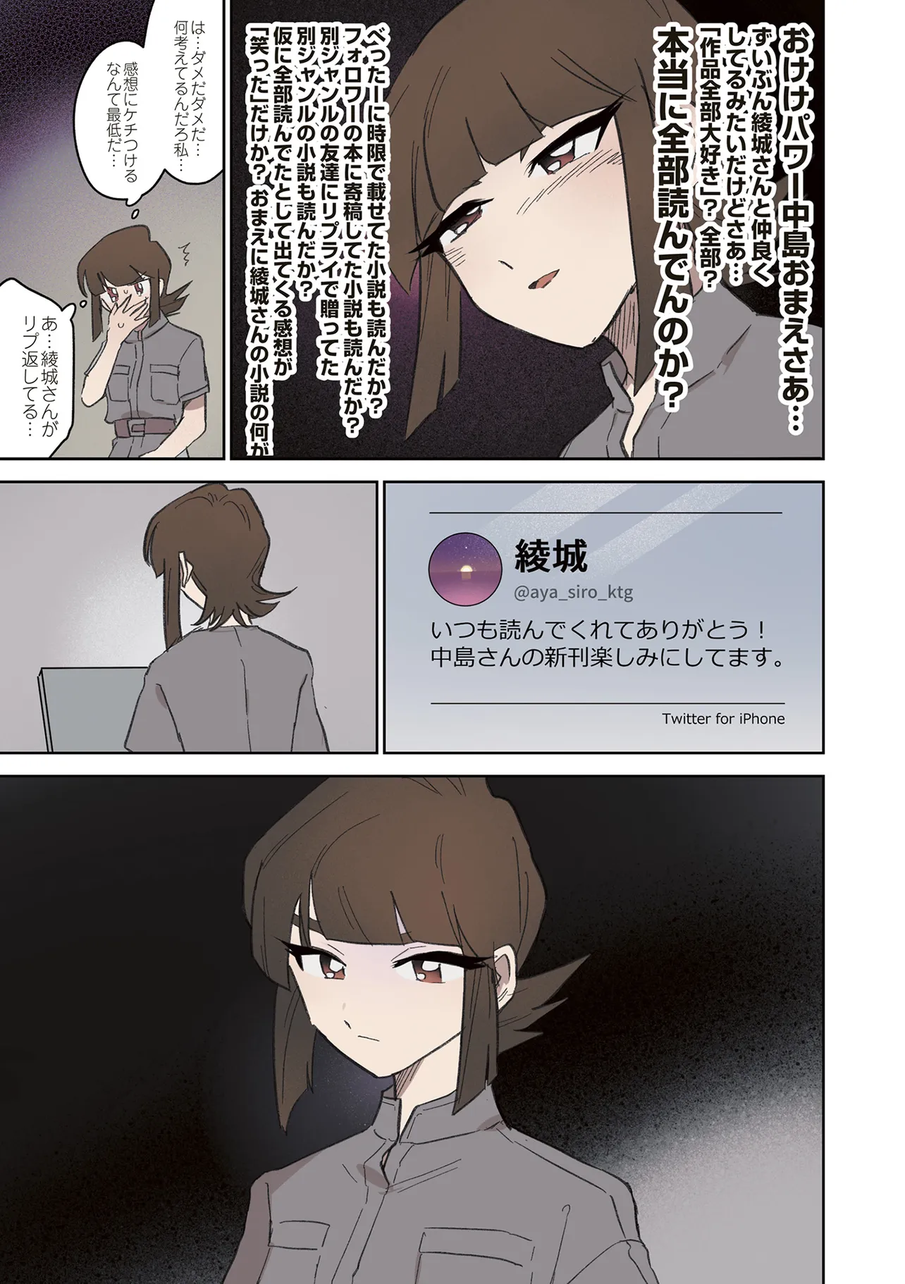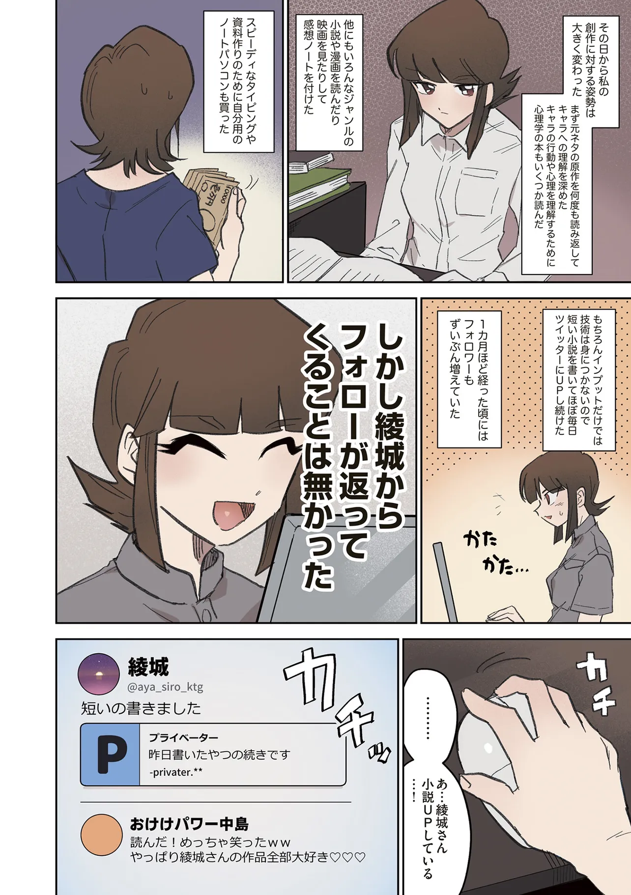 憧憬、羨望、執着、嫉妬、愛…同人活動をする者達のほぼ全てがここにある! 類まれなる文章力で二次創作界に燦然と輝く天才字書き・綾城(あやしろ)。 同ジャンルの者達はその作品に焦がれ、打ちひしがれ、彼女に馴れ馴れしくリプを飛ばす「おけけパワー中島」への憎悪をくすぶらせていくのであった……。 天才字書きをめぐる創作者たちの葛藤を綴った連作。