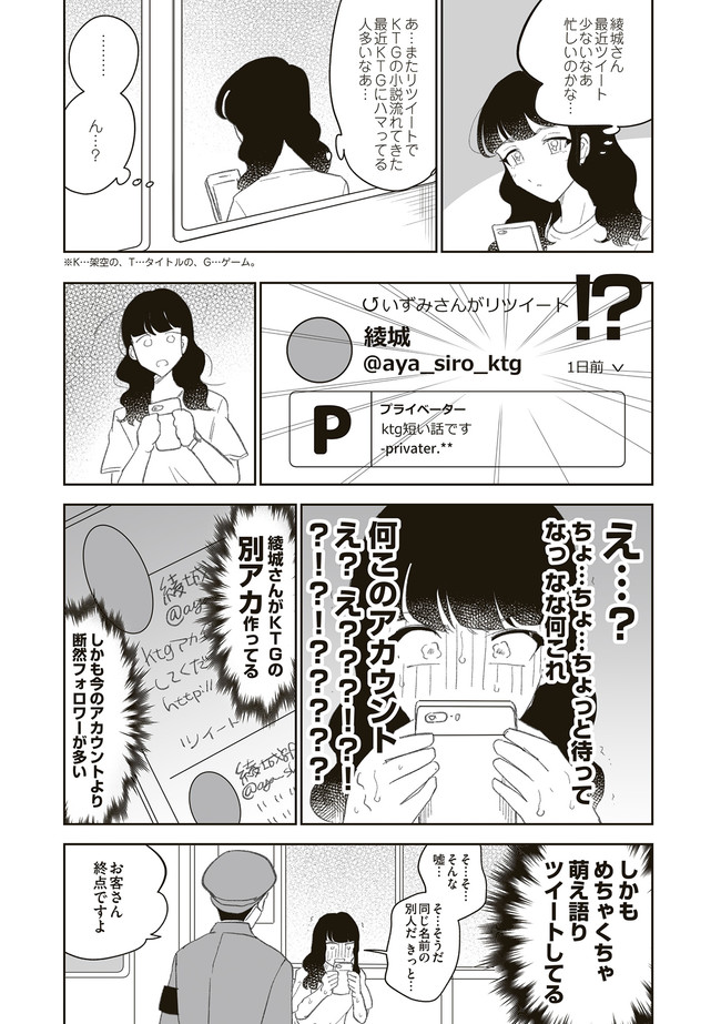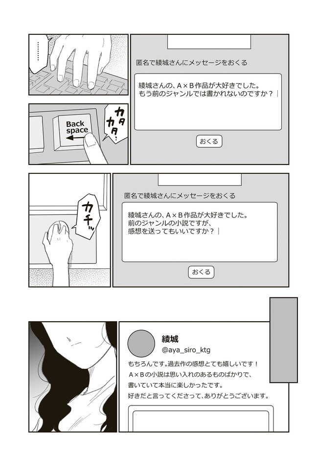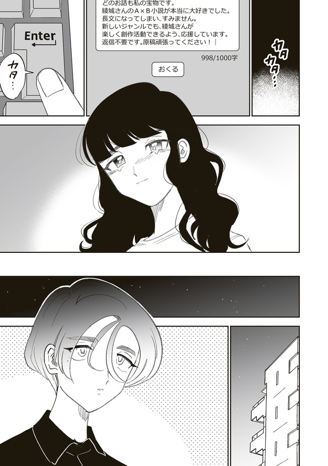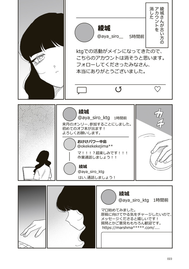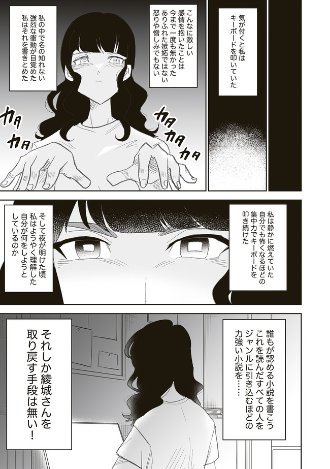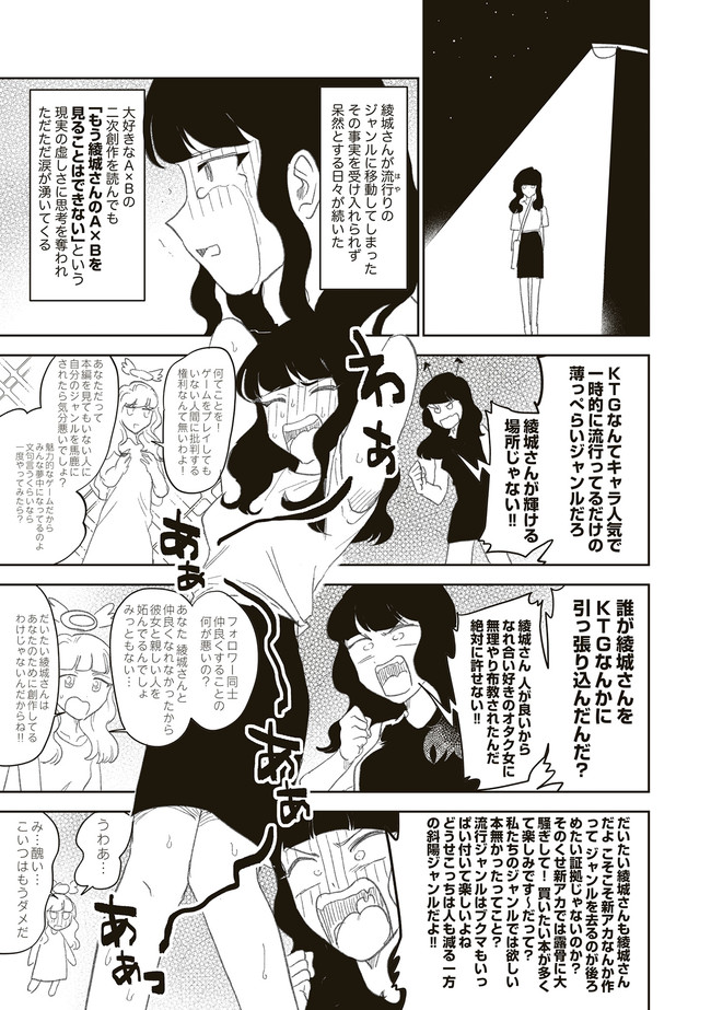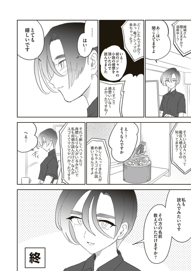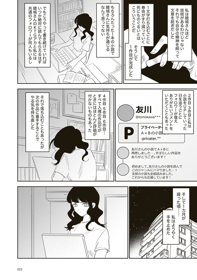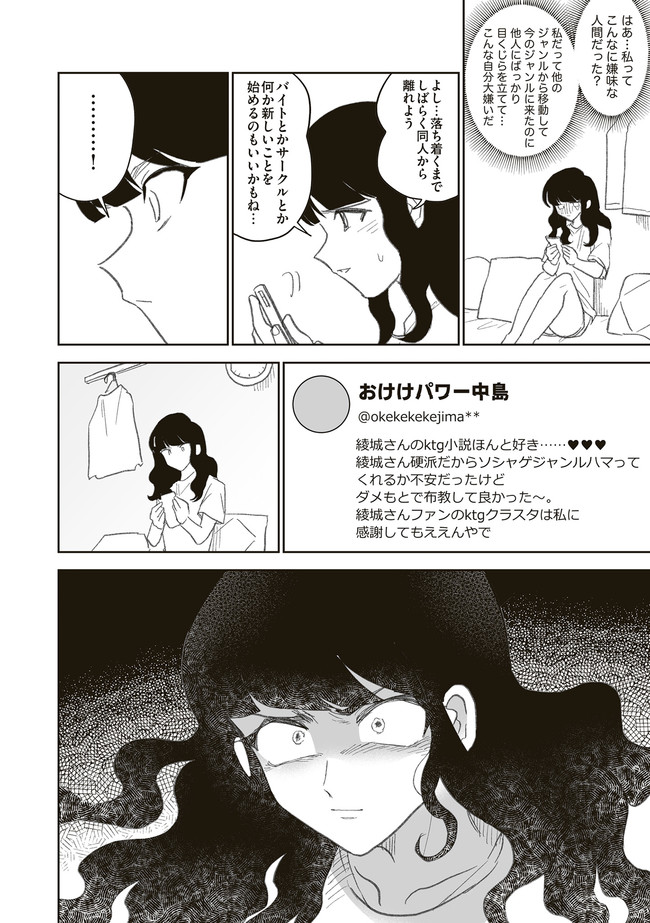 憧憬、羨望、執着、嫉妬、愛…同人活動をする者達のほぼ全てがここにある! 類まれなる文章力で二次創作界に燦然と輝く天才字書き・綾城(あやしろ)。 同ジャンルの者達はその作品に焦がれ、打ちひしがれ、彼女に馴れ馴れしくリプを飛ばす「おけけパワー中島」への憎悪をくすぶらせていくのであった……。 天才字書きをめぐる創作者たちの葛藤を綴った連作。