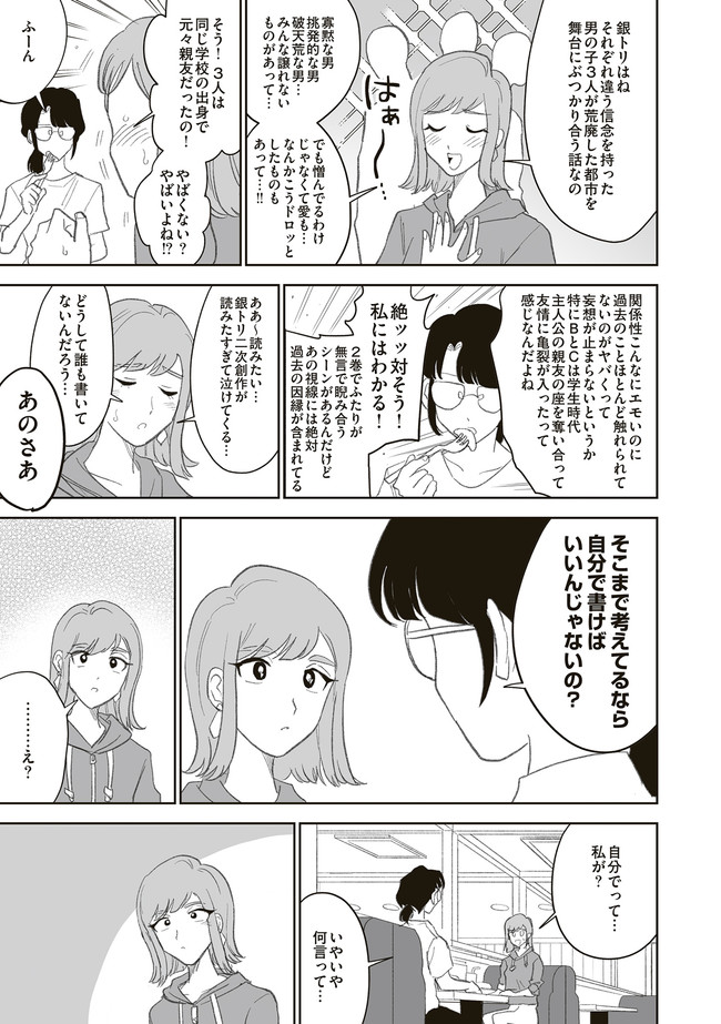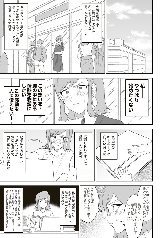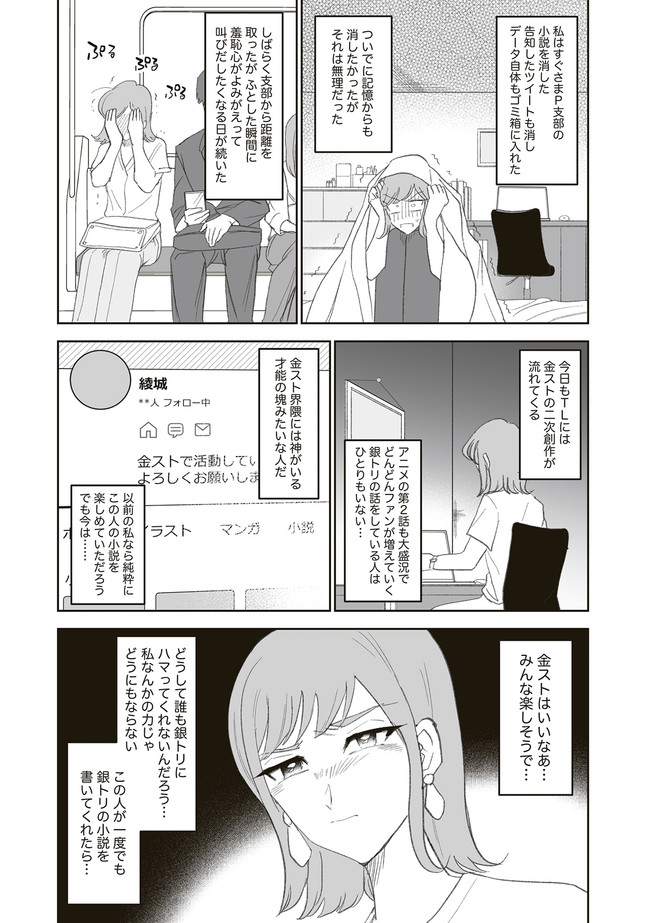 憧憬、羨望、執着、嫉妬、愛…同人活動をする者達のほぼ全てがここにある! 類まれなる文章力で二次創作界に燦然と輝く天才字書き・綾城(あやしろ)。 同ジャンルの者達はその作品に焦がれ、打ちひしがれ、彼女に馴れ馴れしくリプを飛ばす「おけけパワー中島」への憎悪をくすぶらせていくのであった……。 天才字書きをめぐる創作者たちの葛藤を綴った連作。