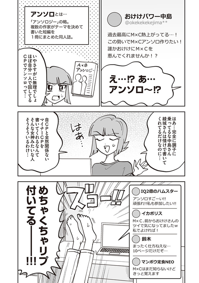 憧憬、羨望、執着、嫉妬、愛…同人活動をする者達のほぼ全てがここにある! 類まれなる文章力で二次創作界に燦然と輝く天才字書き・綾城(あやしろ)。 同ジャンルの者達はその作品に焦がれ、打ちひしがれ、彼女に馴れ馴れしくリプを飛ばす「おけけパワー中島」への憎悪をくすぶらせていくのであった……。 天才字書きをめぐる創作者たちの葛藤を綴った連作。