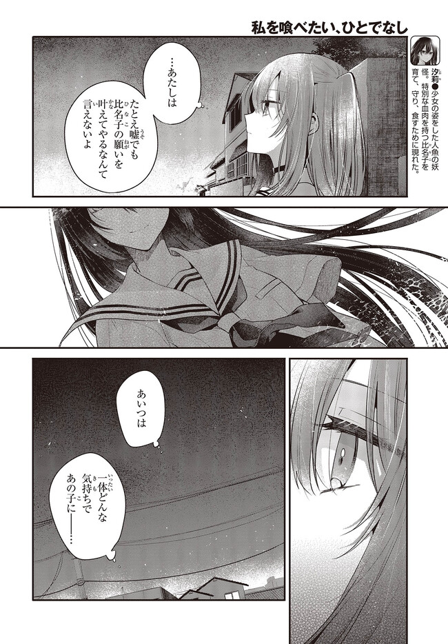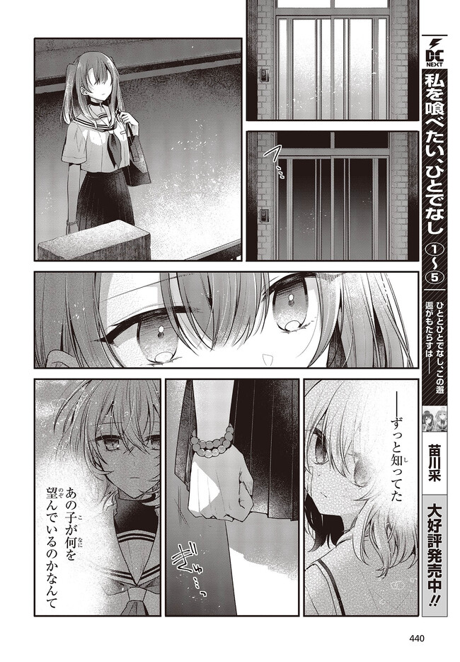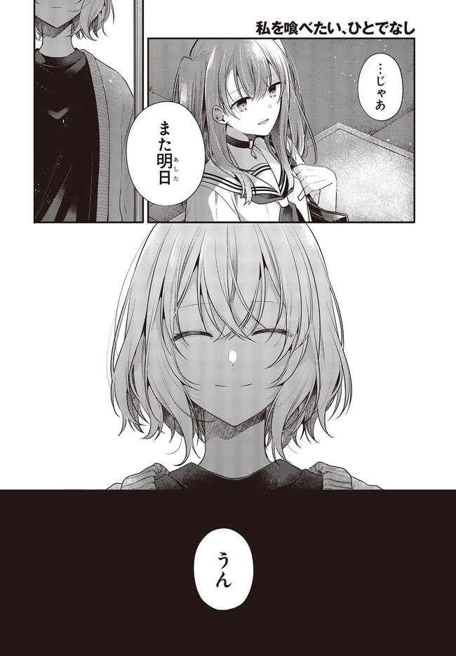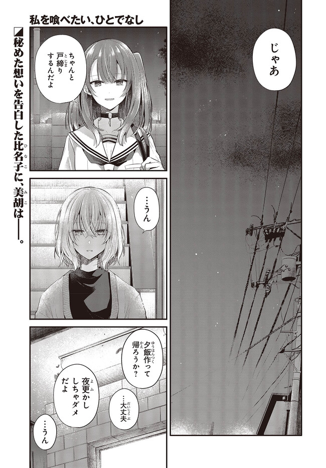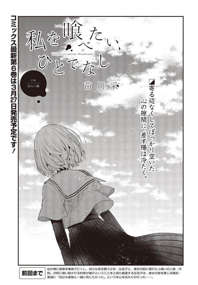 私を喰べたい、ひとでなし 第27話① 私を喰べたい、ひとでなし 投稿者 admin - 3年 前に 幸せな読書漫画 私を喰べたい、ひとでなし 第27話① , いいねと共有ボタンをクリックすることを忘れないでください. Manga 私を喰べたい、ひとでなし 常に更新されます 無料コミック Comic Top. 他のマンガの更新を読むことを忘れないでください。 マンガコレクションのリスト 無料コミック Comic Top マンガリストメニューにあります. お友達と共有しましょう! Facebook Twitter Pinterest Whatsapp 前のエピソード すべての章 次のエピソード リスト ページング Loading.. 前のエピソード すべての章 次のエピソード リスト ページング お友達と共有しましょう! Facebook Twitter Pinterest Whatsapp お気に入りに追加に続く 4 人 私を喰べたい、ひとでなし 海辺の街にひとり暮らす女子高生・比名子(ひなこ)は、凄惨な過去の記憶に囚われ、海の底にいるようないきぐるしさを覚える日々を送っていた。 そんな彼女の前に、ある日汐莉(しおり)と名乗る海色の瞳をした少女が現れ…。 「私は君を食べに来ました。」 「君が美味しく育つまで、私が君を守ってみせます。」 この邂逅がもたらすのは破滅か、それとも――。 苗川采(著者) BOOK☆WALKERでセール中!!人外女子高生怪異恋愛百合電撃マオウ