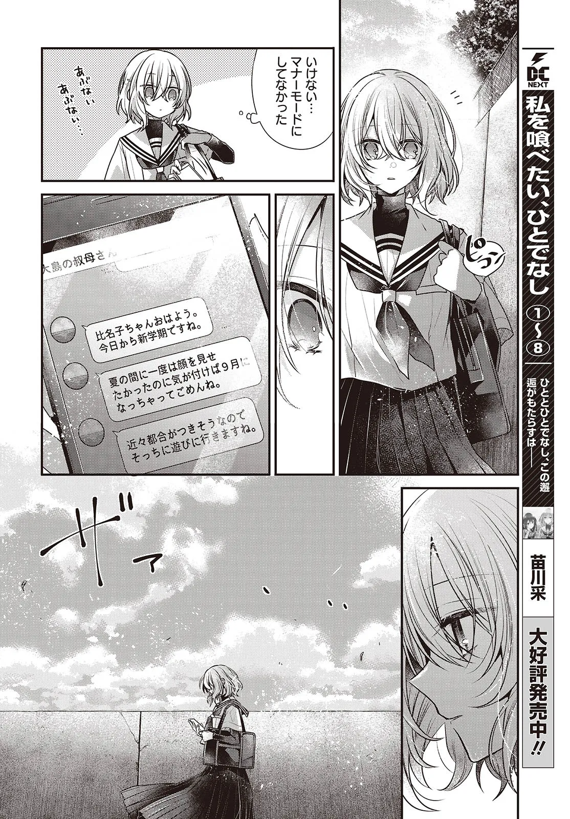 私を喰べたい、ひとでなし 第42話① 私を喰べたい、ひとでなし 投稿者 admin - 1年 前に 幸せな読書漫画 私を喰べたい、ひとでなし 第42話① , いいねと共有ボタンをクリックすることを忘れないでください. Manga 私を喰べたい、ひとでなし 常に更新されます 無料コミック Comic Top. 他のマンガの更新を読むことを忘れないでください。 マンガコレクションのリスト 無料コミック Comic Top マンガリストメニューにあります. お友達と共有しましょう! Facebook Twitter Pinterest Whatsapp 前のエピソード すべての章 次のエピソード リスト ページング Loading.. 前のエピソード すべての章 次のエピソード リスト ページング お友達と共有しましょう! Facebook Twitter Pinterest Whatsapp お気に入りに追加に続く 4 人 私を喰べたい、ひとでなし 海辺の街にひとり暮らす女子高生・比名子(ひなこ)は、凄惨な過去の記憶に囚われ、海の底にいるようないきぐるしさを覚える日々を送っていた。 そんな彼女の前に、ある日汐莉(しおり)と名乗る海色の瞳をした少女が現れ…。 「私は君を食べに来ました。」 「君が美味しく育つまで、私が君を守ってみせます。」 この邂逅がもたらすのは破滅か、それとも――。 苗川采(著者) BOOK☆WALKERでセール中!!人外女子高生怪異恋愛百合電撃マオウ
