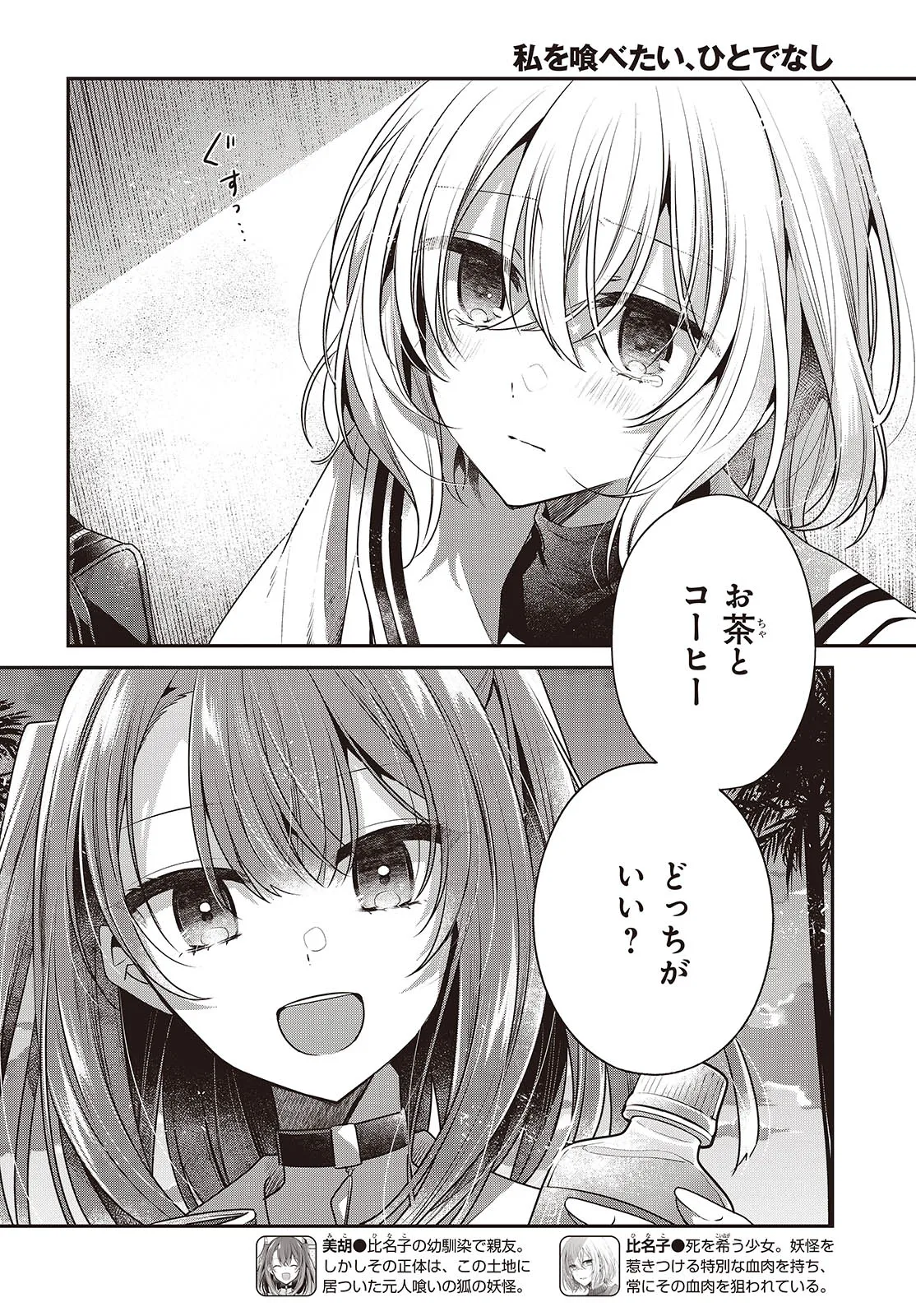 海辺の街にひとり暮らす女子高生・比名子(ひなこ)は、凄惨な過去の記憶に囚われ、海の底にいるようないきぐるしさを覚える日々を送っていた。 そんな彼女の前に、ある日汐莉(しおり)と名乗る海色の瞳をした少女が現れ…。 「私は君を食べに来ました。」 「君が美味しく育つまで、私が君を守ってみせます。」 この邂逅がもたらすのは破滅か、それとも――。