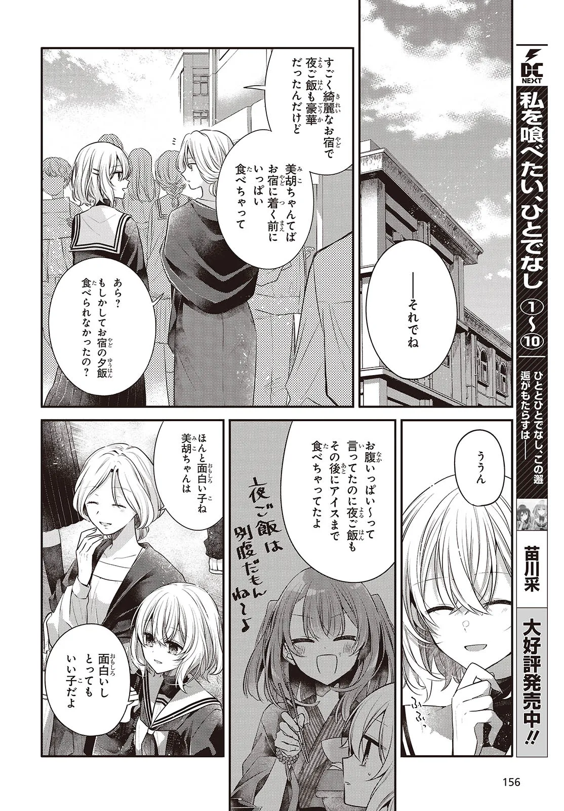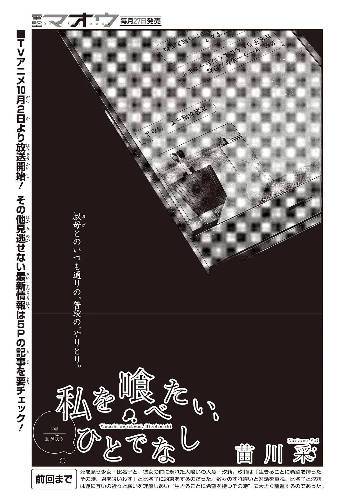 私を喰べたい、ひとでなし 第50話① 私を喰べたい、ひとでなし 投稿者 admin - 3か月 前に 幸せな読書漫画 私を喰べたい、ひとでなし 第50話① , いいねと共有ボタンをクリックすることを忘れないでください. Manga 私を喰べたい、ひとでなし 常に更新されます 無料コミック Comic Top. 他のマンガの更新を読むことを忘れないでください。 マンガコレクションのリスト 無料コミック Comic Top マンガリストメニューにあります. お友達と共有しましょう! Facebook Twitter Pinterest Whatsapp 前のエピソード すべての章 次のエピソード リスト ページング Loading.. 前のエピソード すべての章 次のエピソード リスト ページング お友達と共有しましょう! Facebook Twitter Pinterest Whatsapp お気に入りに追加に続く 4 人 私を喰べたい、ひとでなし 海辺の街にひとり暮らす女子高生・比名子(ひなこ)は、凄惨な過去の記憶に囚われ、海の底にいるようないきぐるしさを覚える日々を送っていた。 そんな彼女の前に、ある日汐莉(しおり)と名乗る海色の瞳をした少女が現れ…。 「私は君を食べに来ました。」 「君が美味しく育つまで、私が君を守ってみせます。」 この邂逅がもたらすのは破滅か、それとも――。 苗川采(著者) BOOK☆WALKERでセール中!!人外女子高生怪異恋愛百合電撃マオウ