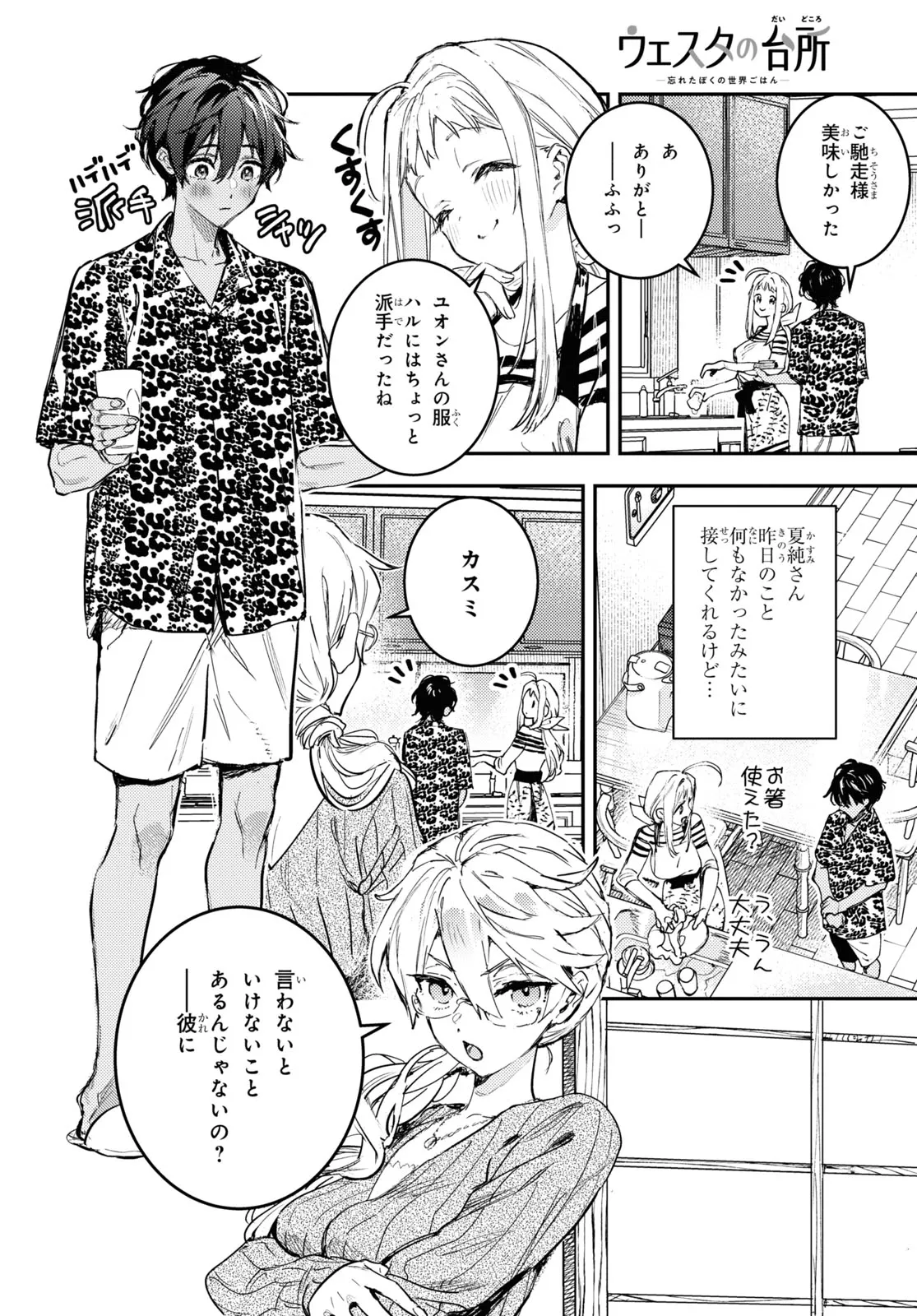 ウェスタの台所 第2話 ウェスタの台所 投稿者 admin - 2年 前に 幸せな読書漫画 ウェスタの台所 第2話 , いいねと共有ボタンをクリックすることを忘れないでください. Manga ウェスタの台所 常に更新されます 無料コミック Comic Top. 他のマンガの更新を読むことを忘れないでください。 マンガコレクションのリスト 無料コミック Comic Top マンガリストメニューにあります. お友達と共有しましょう! Facebook Twitter Pinterest Whatsapp 前のエピソード すべての章 次のエピソード リスト ページング Loading.. 前のエピソード すべての章 次のエピソード リスト ページング お友達と共有しましょう! Facebook Twitter Pinterest Whatsapp お気に入りに追加に続く 0 人 ウェスタの台所 外国人専用下宿で寮母を務める夏純は、庭先に迷い込んだ記憶喪失の少年・ハルを保護することになった。しかしハルの出自には謎が多く、住人含め誰もハルの記憶の手がかりを掴めなかった。そこで夏純は提案する。「世界中の色々な料理を食べさせれば、ハルの故郷の味が見つかるかもしれない!」――この物語は、記憶を取り戻すために世界中のグルメに舌鼓を打つ少年の記録である。 いのうえひなこ グルメ同居家族料理現代生活・ライフスタイル