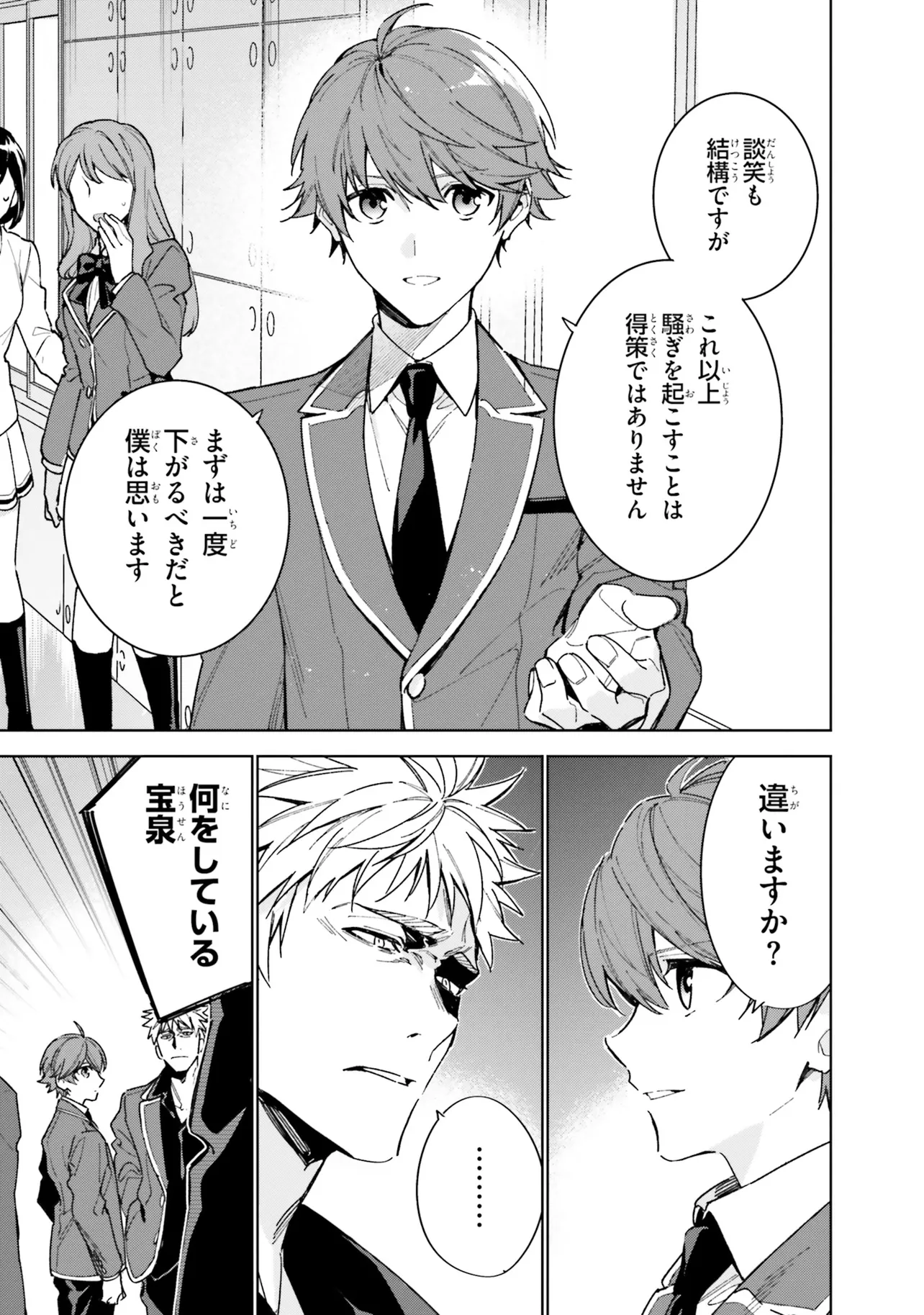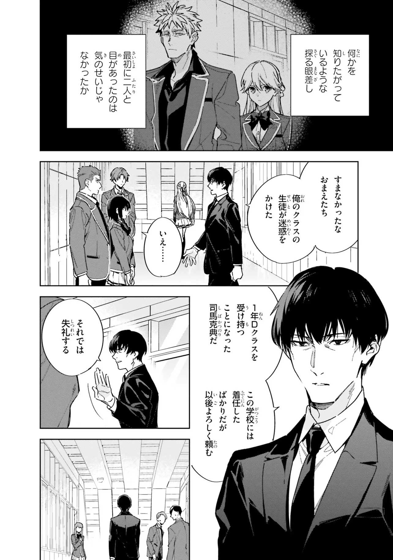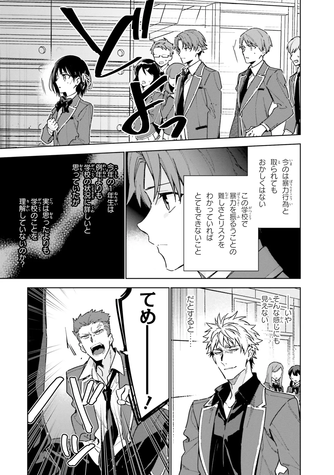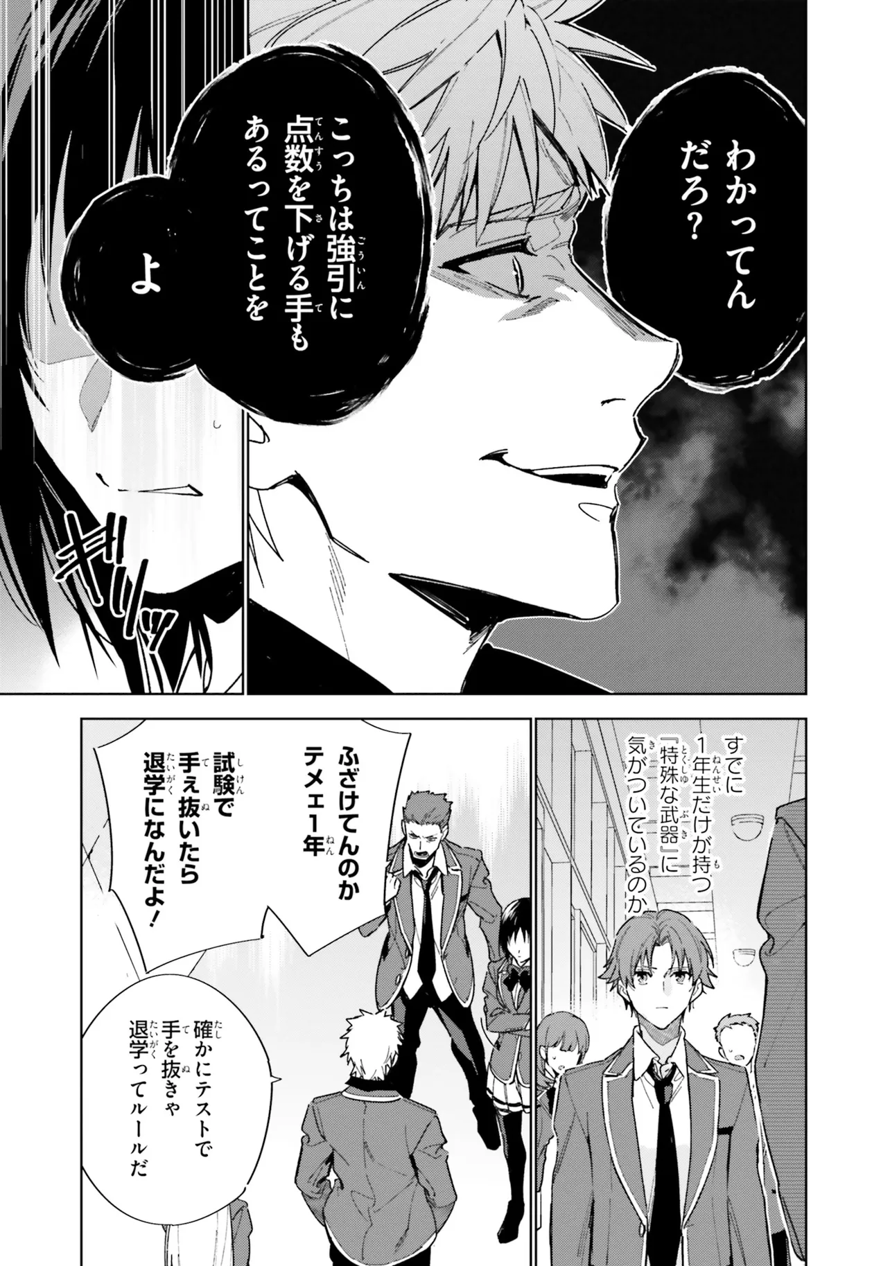 1年の最終特別試験と月城の企みをかわし、無事高度育成高校の2年生へと進級した綾小路。 短い春休みの後に行われる入学式。4月のその時を迎え、新1年生がついに姿を現した。 2年生にも負けず劣らず、学校に新たな波乱を呼びそうな個性的な面々の新1年生達。 そして――この中に、ホワイトルームの刺客がいる。 2年クラス同士の試験対決、Aクラスを目指すための布石、 執拗な月城とその刺客の襲撃をかわし一撃を与えること、そして自らの人間関係。 一筋縄ではいかない高度育成高校での2年目の日々がついに始まる――。