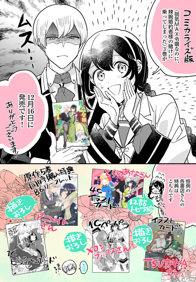 弱気MAX令嬢なのに、辣腕婚約者様の賭けに乗ってしまった コミックス3巻告知マンガ
